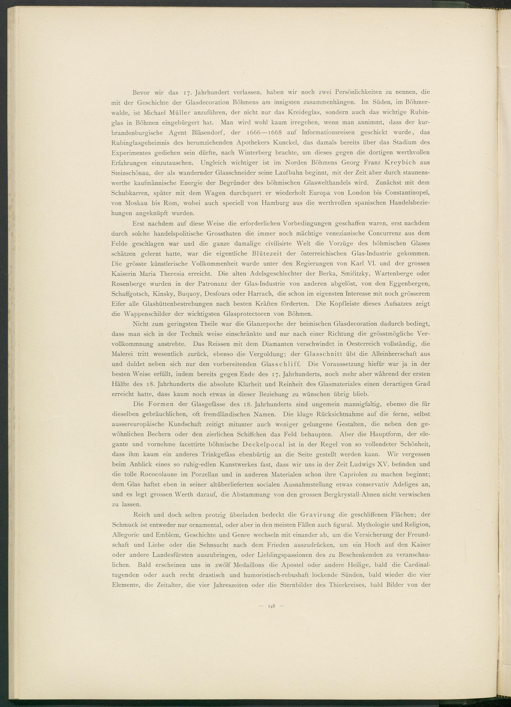 Bevor wir das 17. Jahrhundert verlassen, haben wir noch zwei Persönlichkeiten zu nennen, die mit der Geschichte der Glasdecoration Böhmens am innigsten Zusammenhängen. Im Süden, im Böhmerwalde, ist Michael Müller anzuführen, der nicht nur das Kreideglas, sondern auch das wichtige Rubinglas in Böhmen eingebürgert hat. Man wird wohl kaum irregehen, wenn man annimmt, dass der kur- brandenburgische Agent Bläsendorf, der 1666—1668 auf Informationsreisen geschickt wurde, das Rubinglasgeheimnis des herumziehenden Apothekers Kunckel, das damals bereits über das Stadium des Experimentes gediehen sein dürfte, nach Winterberg brachte, um dieses gegen die dortigen werthvollen Erfahrungen einzutauschen. Ungleich wichtiger ist im Norden Böhmens Georg Franz Kreybich aus Steinschönau, der als wandernder Glasschneider seine Laufbahn beginnt, mit der Zeit aber durch staunens- werthe kaufmännische Energie der Begründer des böhmischen Glaswelthandels wird. Zunächst mit dem Schubkarren, später mit dem Wagen durchquert er wiederholt Europa von London bis Constantinopel, von Moskau bis Rom, wobei auch speciell von Hamburg aus die werthvollen spanischen Handelsbeziehungen angeknüpft wurden.