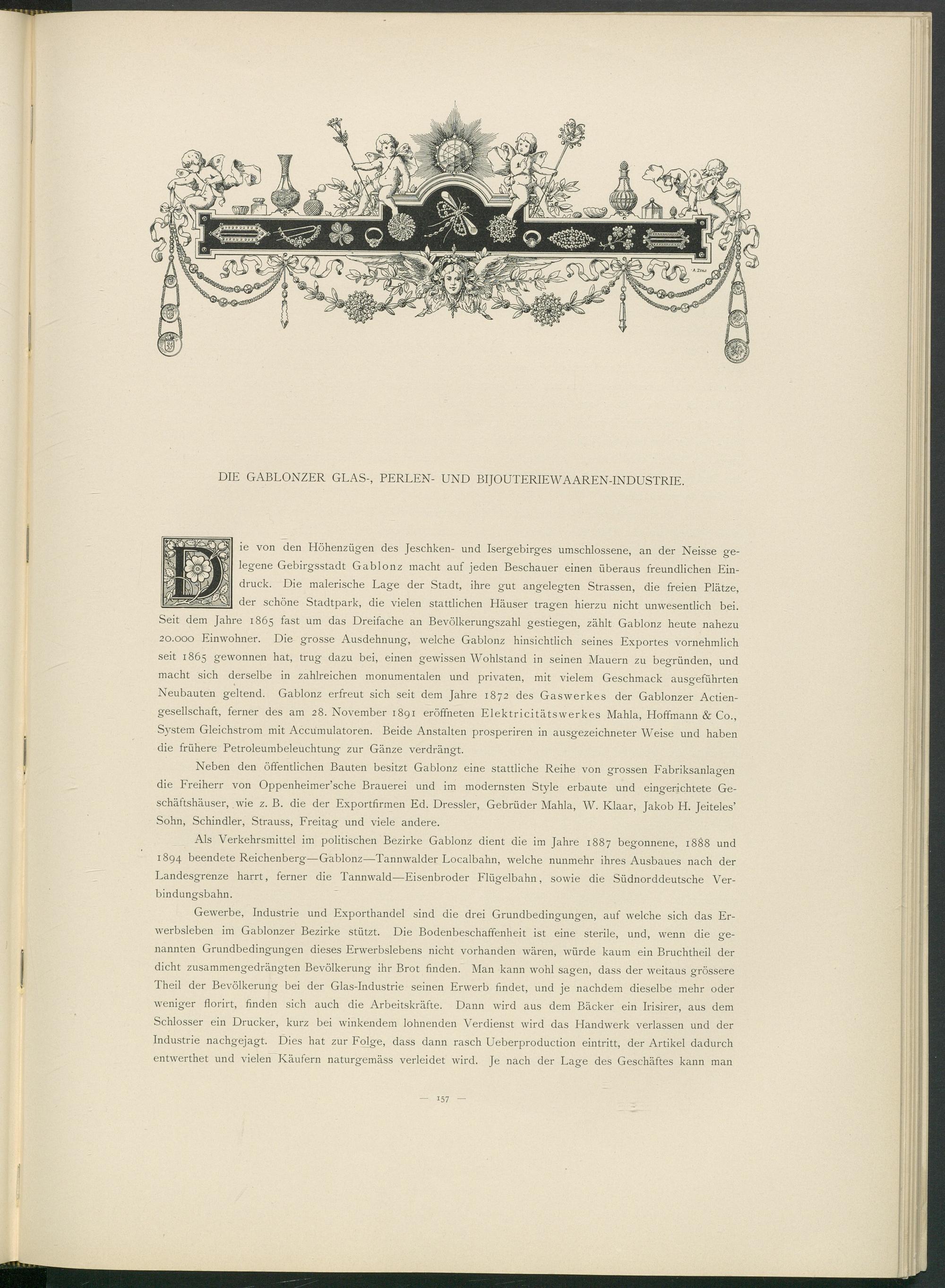 ie von den Höhenzügen des Jeschken- und Isergebirges umschlossene, an der Neisse gelegene Gebirgsstadt Gablonz macht auf jeden Beschauer einen überaus freundlichen Eindruck. Die malerische Lage der Stadt, ihre gut angelegten Strassen, die freien Plätze, der schöne Stadtpark, die vielen stattlichen Häuser tragen hierzu nicht unwesentlich bei. Seit dem Jahre 1865 fast um das Dreifache an Bevölkerungszahl gestiegen, zählt Gablonz heute nahezu 20.000 Einwohner. Die grosse Ausdehnung, welche Gablonz hinsichtlich seines Exportes vornehmlich seit 1865 gewonnen hat, trug dazu bei, einen gewissen Wohlstand in seinen Mauern zu begründen, und macht sich derselbe in zahlreichen monumentalen und privaten, mit vielem Geschmack ausgeführten Neubauten geltend. Gablonz erfreut sich seit dem Jahre 1872 des Gaswerkes der Gablonzer Actien- gesellschaft, ferner des am 28. November 1891 eröffneten ElektricitätsWerkes Mahla, Hoffmann & Co., System Gleichstrom mit Accumulatoren. Beide Anstalten prosperiren in ausgezeichneter Weise und haben die frühere Petroleumbeleuchtung zur Gänze verdrängt.