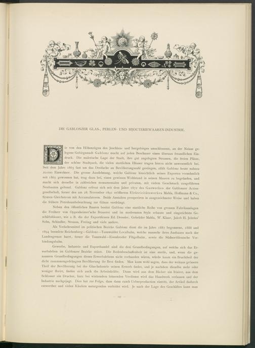 Neben den öffentlichen Bauten besitzt Gablonz eine stattliche Reihe von grossen Fabriksanlagen die Freiherr von Oppenheimer’sche Brauerei und im modernsten Style erbaute und eingerichtete Geschäftshäuser, wie z. B. die der Exportfirmen Ed. Dressier, Gebrüder Mahla, W. Klaar, Jakob H. Jeiteles’ Sohn, Schindler, Strauss, Freitag und viele andere.