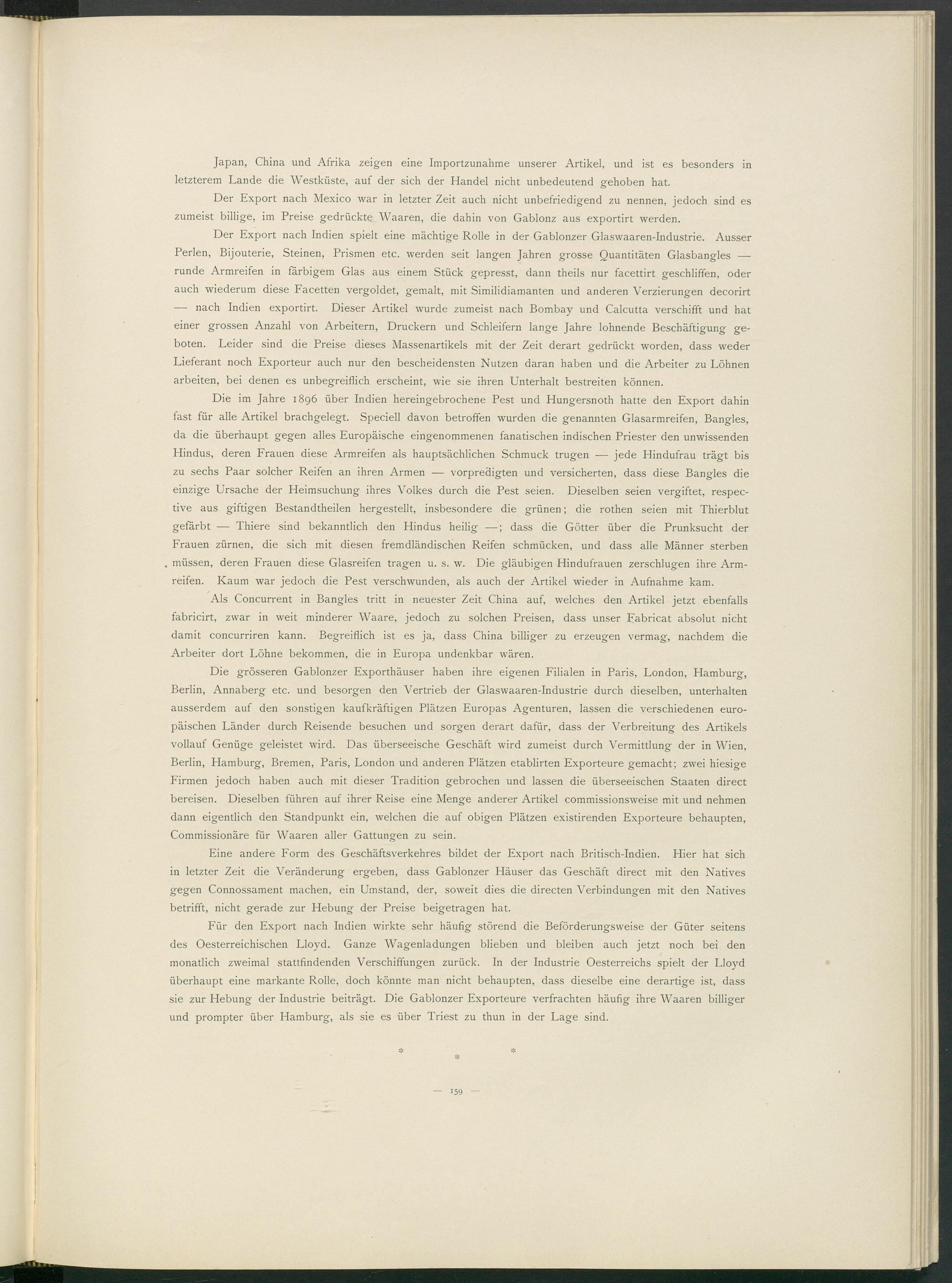 Eine andere Form des Geschäftsverkehres bildet der Export nach Britisch-Indien. Hier hat sich in letzter Zeit die Veränderung ergeben, dass Gablonzer Häuser das Geschäft direct mit den Natives gegen Connossament machen, ein Umstand, der, soweit dies die directen Verbindungen mit den Natives betrifft, nicht gerade zur Hebung der Preise beigetragen hat.