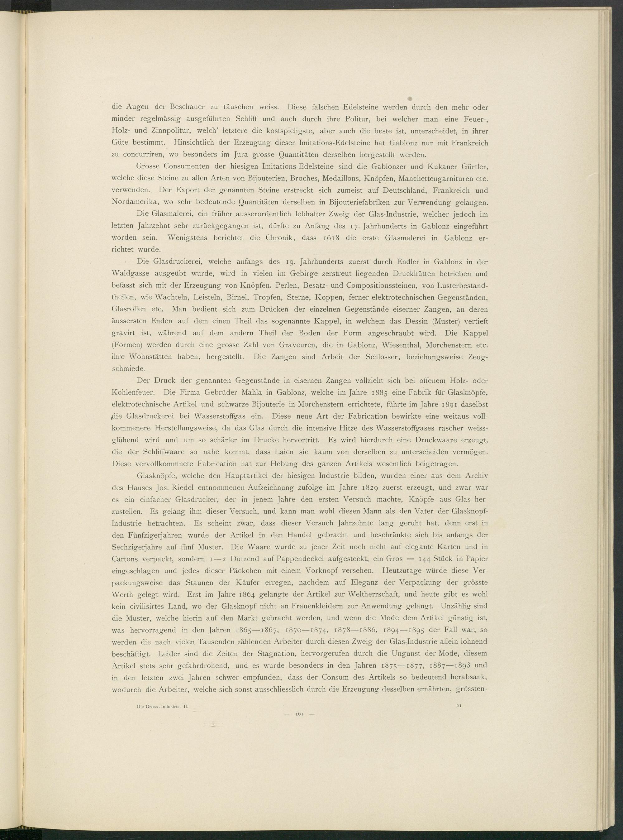 Glasknöpfe, welche den Plauptartikel der hiesigen Industrie bilden, wurden einer aus dem Archiv des Hauses Jos. Riedel entnommenen Aufzeichnung zufolge im Jahre 1829 zuerst erzeugt, und zwar war es ein einfacher Glasdrucker, der in jenem Jahre den ersten Versuch machte, Knöpfe aus Glas herzustellen. Es gelang ihm dieser Versuch, und kann man wohl diesen Mann als den Vater der Glasknopf- Industrie betrachten. Es scheint zwar, dass dieser Versuch Jahrzehnte lang geruht hat, denn erst in den Fünfzigerjahren wurde der Artikel in den Handel gebracht und beschränkte sich bis anfangs der Sechzigerjahre auf fünf Muster. Die Waare wurde zu jener Zeit noch nicht, auf elegante Karten und in Cartons verpackt, sondern 1—2 Dutzend auf Pappendeckel aufgesteckt, ein Gros = 144 Stück in Papier eingeschlagen und jedes dieser Päckchen mit einem Vorknopf versehen. Heutzutage würde diese Verpackungsweise das Staunen der Käufer erregen, nachdem auf Eleganz der Verpackung der grösste Werth gelegt wird. Erst im Jahre 1864 gelangte der Artikel zur Weltherrschaft, und heute gibt es wohl kein civilisirtes Land, wo der Glasknopf nicht an Frauenkleidern zur Anwendung gelangt. Unzählig sind die Muster, welche hierin auf den Markt gebracht werden, und wenn die Mode dem Artikel günstig ist, was hervorragend in den Jahren 1865 —1867, 1870—1874, 1878—1886, 1894—1895 der Fall war, so werden die nach vielen Tausenden zählenden Arbeiter durch diesen Zweig der Glasindustrie allein lohnend beschäftigt. Leider sind die Zeiten der Stagnation, hervorgerufen durch die Ungunst der Mode, diesem Artikel stets sehr gefahrdrohend, und es wurde besonders in den Jahren 1875— 1 877, 1887—1893 und in den letzten zwei Jahren schwer empfunden, dass der Consum des Artikels so bedeutend herabsank, wodurch die Arbeiter, welche sich sonst ausschliesslich durch die Erzeugung desselben ernährten, grössten-