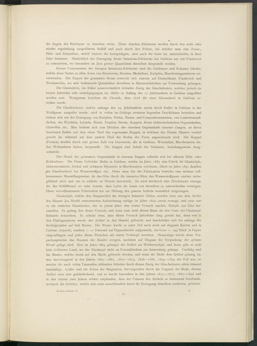 die Augen der Beschauer zu täuschen weiss. Diese falschen Edelsteine werden durch den mehr oder minder regelmässig ausgeführten Schliff und auch durch ihre Politur, bei welcher man eine Feuer-, Holz- und Zinnpolitur, welch’ letztere die kostspieligste, aber auch die beste ist, unterscheidet, in ihrer Güte bestimmt. Hinsichtlich der Erzeugung dieser Imitations-Edelsteine hat Gablonz nur mit Frankreich zu concurriren, wo besonders im Jura grosse Quantitäten derselben hergestellt werden.