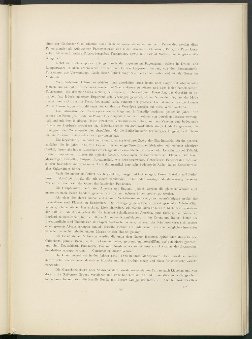 ziffer der Gablonzer Glas-Industrie einen nach Millionen zählenden Artikel. Verwendet werden diese Perlen zumeist als Aufputz von Passementerien und bilden Annaberg, Offenbach, Paris, Le Puys, Lune- ville, Calais und andere Fabricationsplätze Frankreichs, sowie in Russland Moskau, hiefür grosse Absatzgebiete.