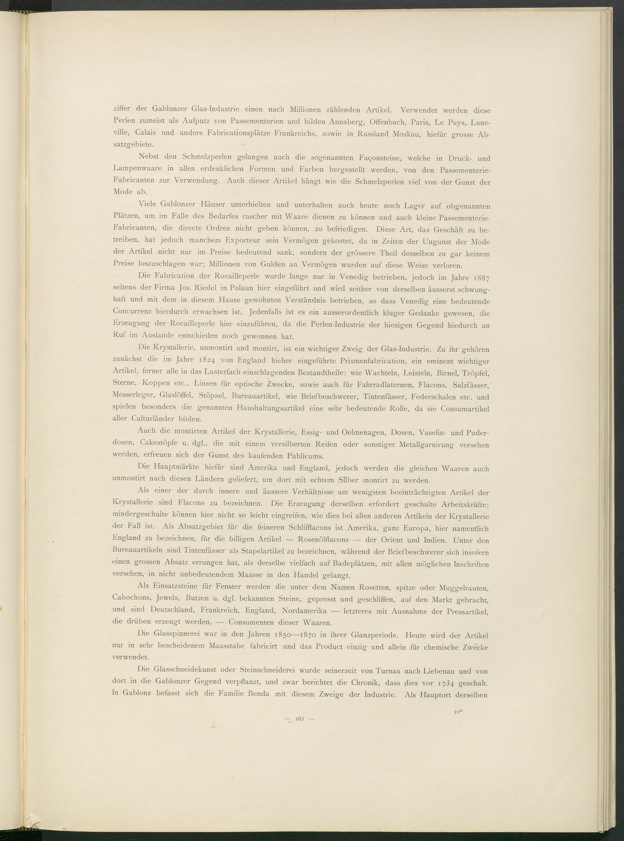 Als einer der durch innere und äussere Verhältnisse am wenigsten beeinträchtigten Artikel der Krystallerie sind Flacons zu bezeichnen. Die Erzeugung derselben erfordert geschulte Arbeitskräfte; mindergeschulte können hier nicht so leicht eingreifen, wie dies bei allen anderen Artikeln der Krystallerie der hall ist. Als Absatzgebiet für die feineren Schlifflacons ist Amerika, ganz Europa, hier namentlich England zu bezeichnen, für die billigen Artikel — Rosenölflacons — der Orient und Indien. Unter den Bureauartikeln sind Tintenfässer als Stapelartikel zu bezeichnen, während der Briefbeschwerer sich insofern einen grossen Absatz errungen hat, als derselbe vielfach auf Badeplätzen, mit allen möglichen Inschriften versehen, in nicht unbedeutendem Maasse in den Handel gelangt.
