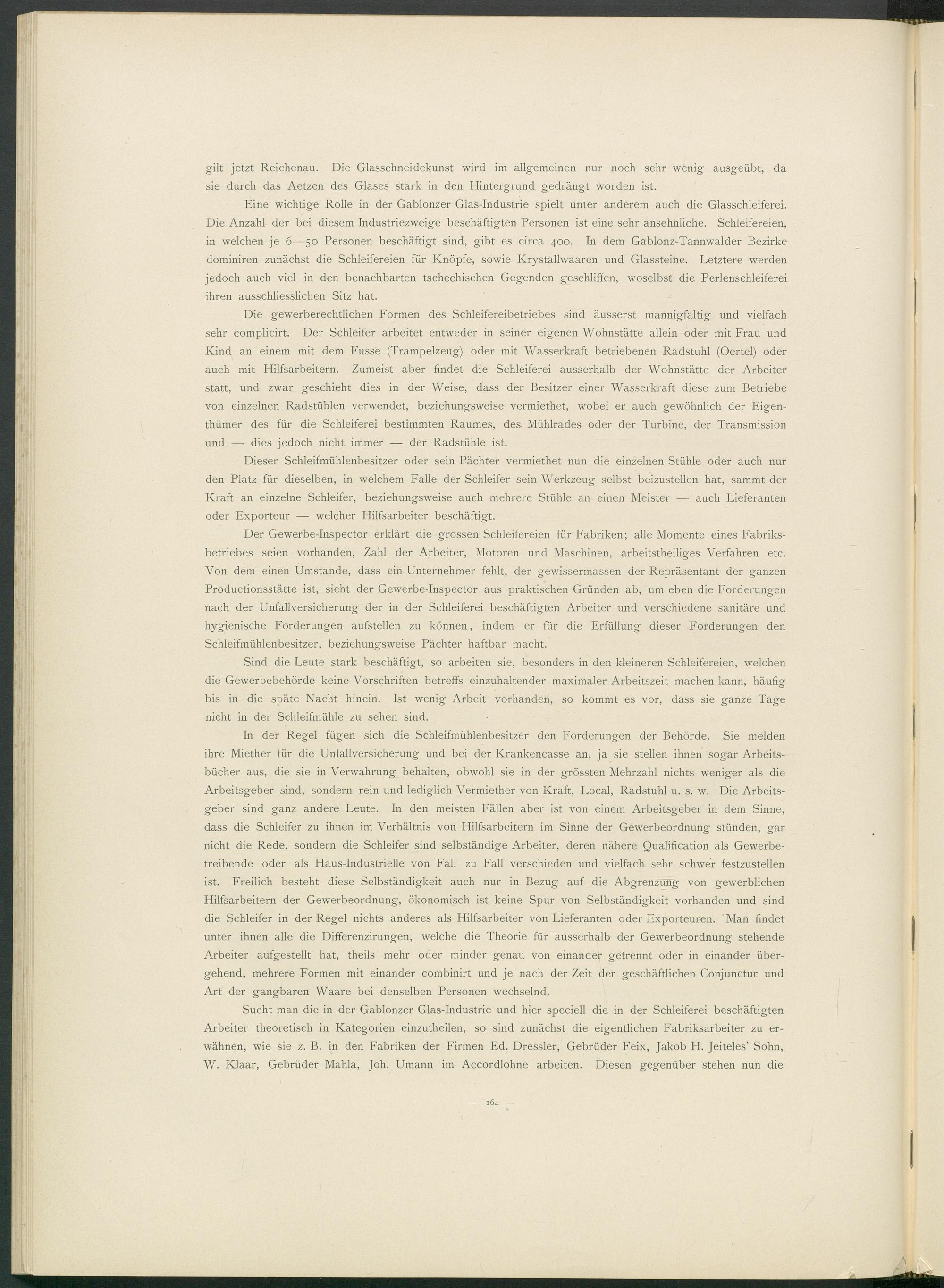 Sucht man die in der Gablonzer Glas-Industrie und hier speciell die in der Schleiferei beschäftigten Arbeiter theoretisch in Kategorien einzutheilen, so sind zunächst die eigentlichen Fabriksarbeiter zu erwähnen, wie sie z. B. in den Fabriken der Firmen Ed. Dressier, Gebrüder Feix, Jakob H. Jeiteles’ Sohn, W. Klaar, Gebrüder Mahla, Joh. Umann im Accordlohne arbeiten. Diesen gegenüber stehen nun die