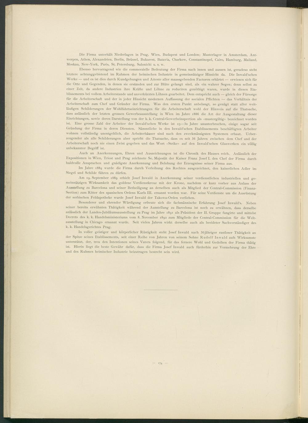 Besonderer und ehrender Würdigung erfreute sich die fachmännische Erfahrung Josef Inwald’s. Neben seiner bereits erwähnten Thätigkeit während der Ausstellung zu Barcelona ist noch zu erwähnen, dass derselbe anlässlich der Landes-Jubiläumsausstellung zu Prag im Jahre i8gi als Präsident der II. Gruppe fung-irte und mittelst Decrets des k. k. Handelsministeriums vom 8. November i8g2 zum Mitgliede der Central-Commission für die Weltausstellung in Chicago ernannt wurde. Seit vielen Jahren wirkt derselbe auch als beeideter Sachverständiger des k. k. Handelsgerichtes Prag.