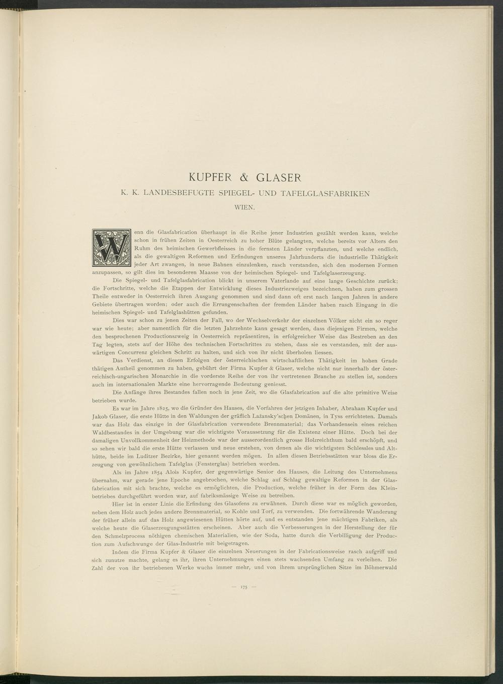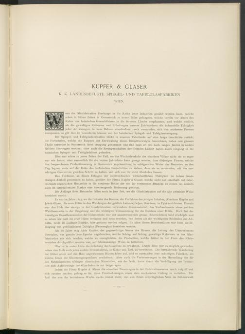 Das Verdienst, an diesen Erfolgen der österreichischen wirtschaftlichen Thätigkeit im hohen Grade thätigen Antheil genommen zu haben, gebührt der Firma Kupfer & Glaser, welche nicht nur innerhalb der österreichisch-ungarischen Monarchie in die vorderste Reihe der von ihr vertretenen Branche zu stellen ist, sondern auch im internationalen Markte eine hervorragende Bedeutung geniesst.