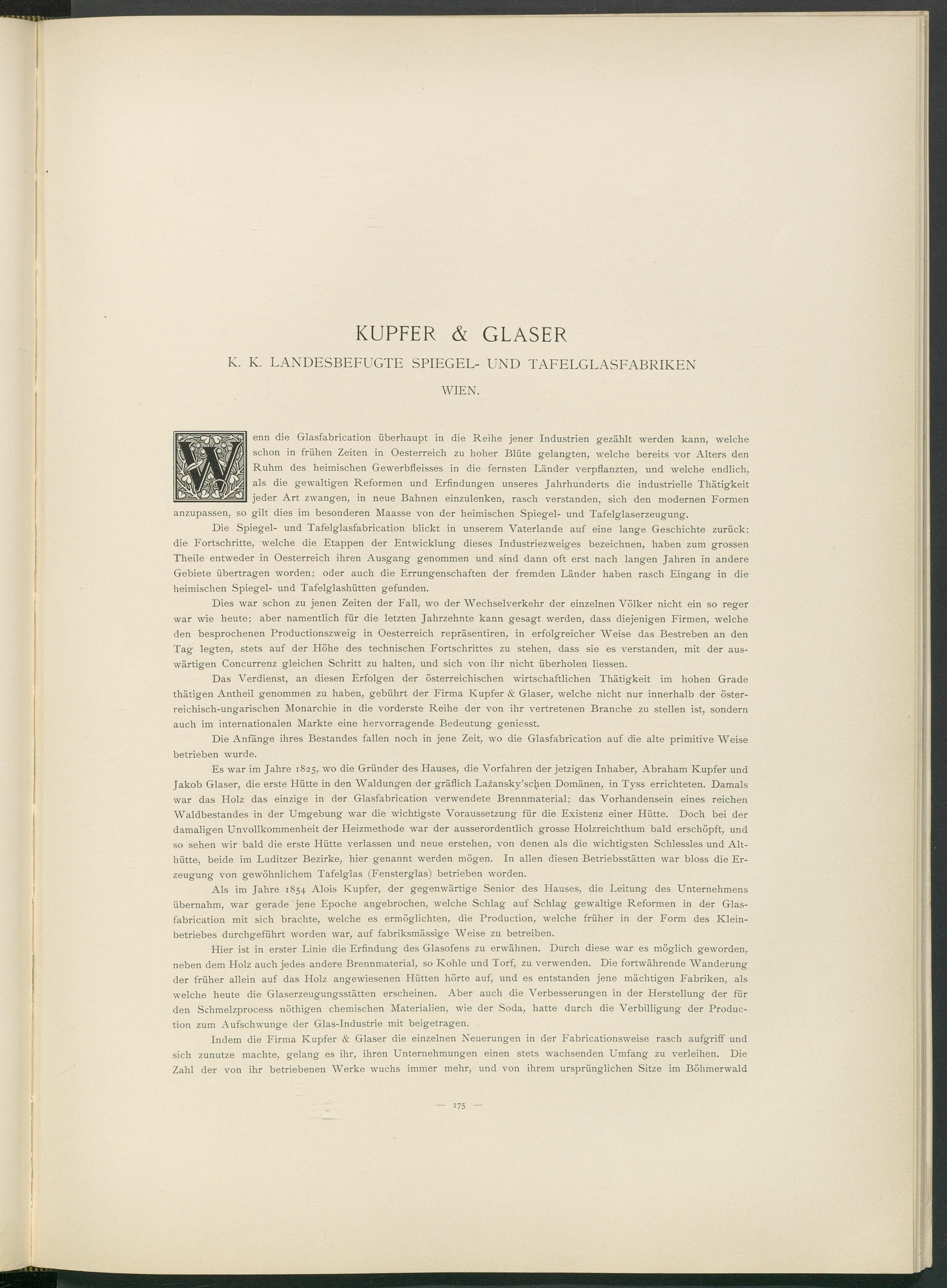 Es war im Jahre 1825, wo die Gründer des Hauses, die Vorfahren der jetzigen Inhaber, Abraham Kupfer und Jakob Glaser, die erste Hütte in den Waldungen der gräflich La 2 ansky’scjien Domänen, in Tyss errichteten. Damals war das Holz das einzige in der Glasfabrication verwendete Brennmaterial; das Vorhandensein eines reichen Waldbestandes in der Umgebung war die wichtigste Voraussetzung für die Existenz einer Hütte. Doch bei der damaligen Unvollkommenheit der Heizmethode war der ausserordentlich grosse Holzreichthum bald erschöpft, und so sehen wir bald die erste Hütte verlassen und neue erstehen, von denen als die wichtigsten Schlessles und Althütte, beide im Luditzer Bezirke, hier genannt werden mögen. In allen diesen Betriebsstätten war bloss die Erzeugung von gewöhnlichem Tafelglas (Fensterglas) betrieben worden.