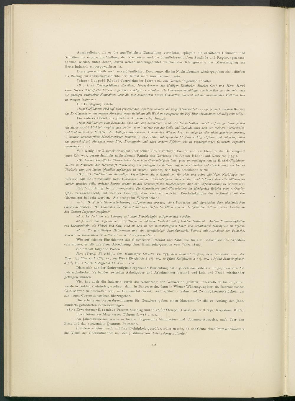 Anschaulicher, als es die ausführlichste Darstellung- vermöchte, spiegeln die erhaltenen Urkunden und Schriften die eigenartige Stellung der Glasmeister und die öffentlich-rechtlichen Zustände und Regierungsmaassnahmen wieder, unter denen, durch welche und ungeachtet welcher das Kleingewerbe der Glaserzeugung zur Gross-Industrie emporgewachsen ist.