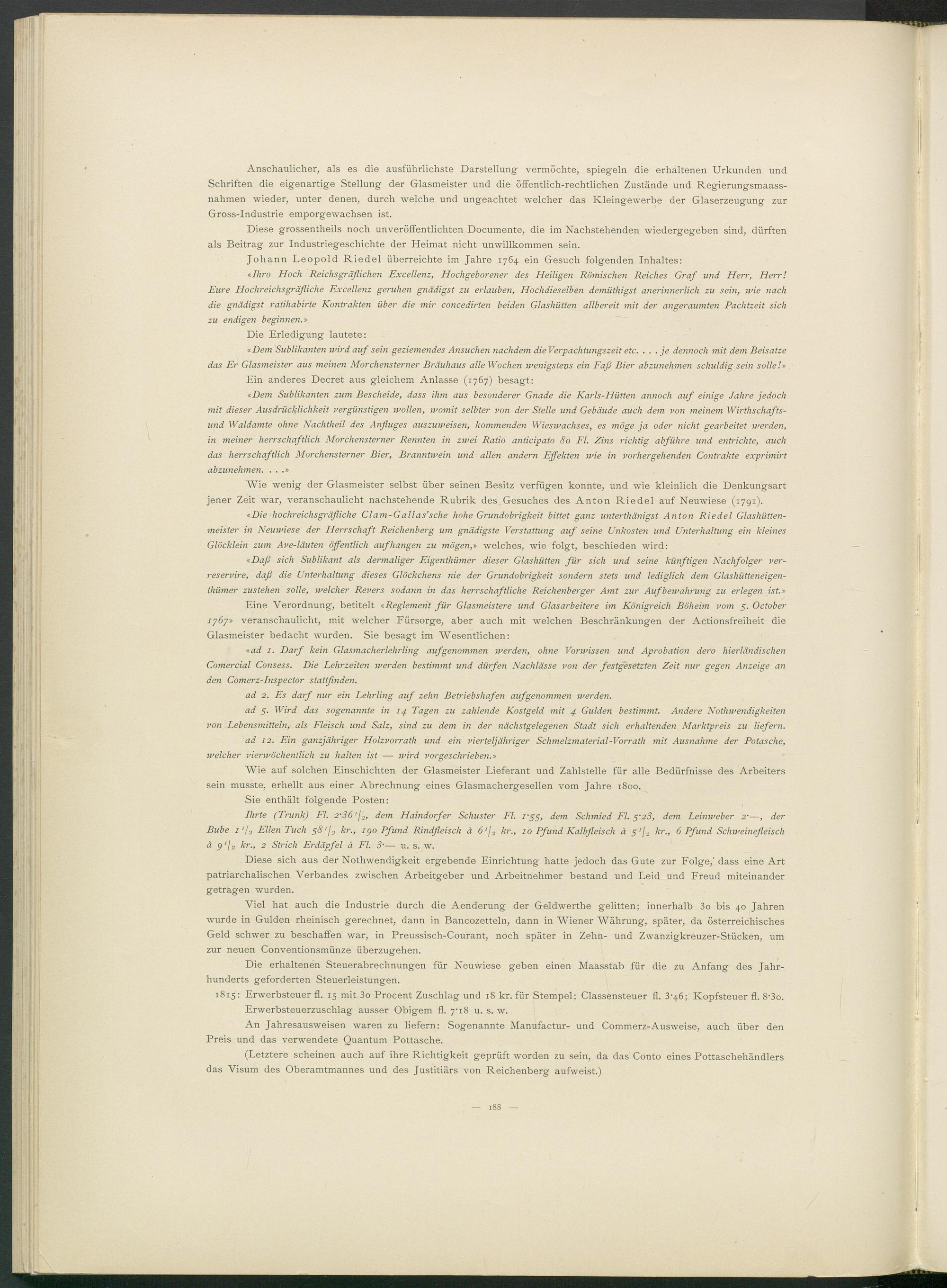 Eine Verordnung, betitelt «Reglement für Glasmeistere und Glasarbeitere im Königreich Böheim vom 5. October ijöj» veranschaulicht, mit welcher Fürsorge, aber auch mit welchen Beschränkungen der Actionsfreiheit die Glasmeister bedacht wurden. Sie besagt im Wesentlichen: