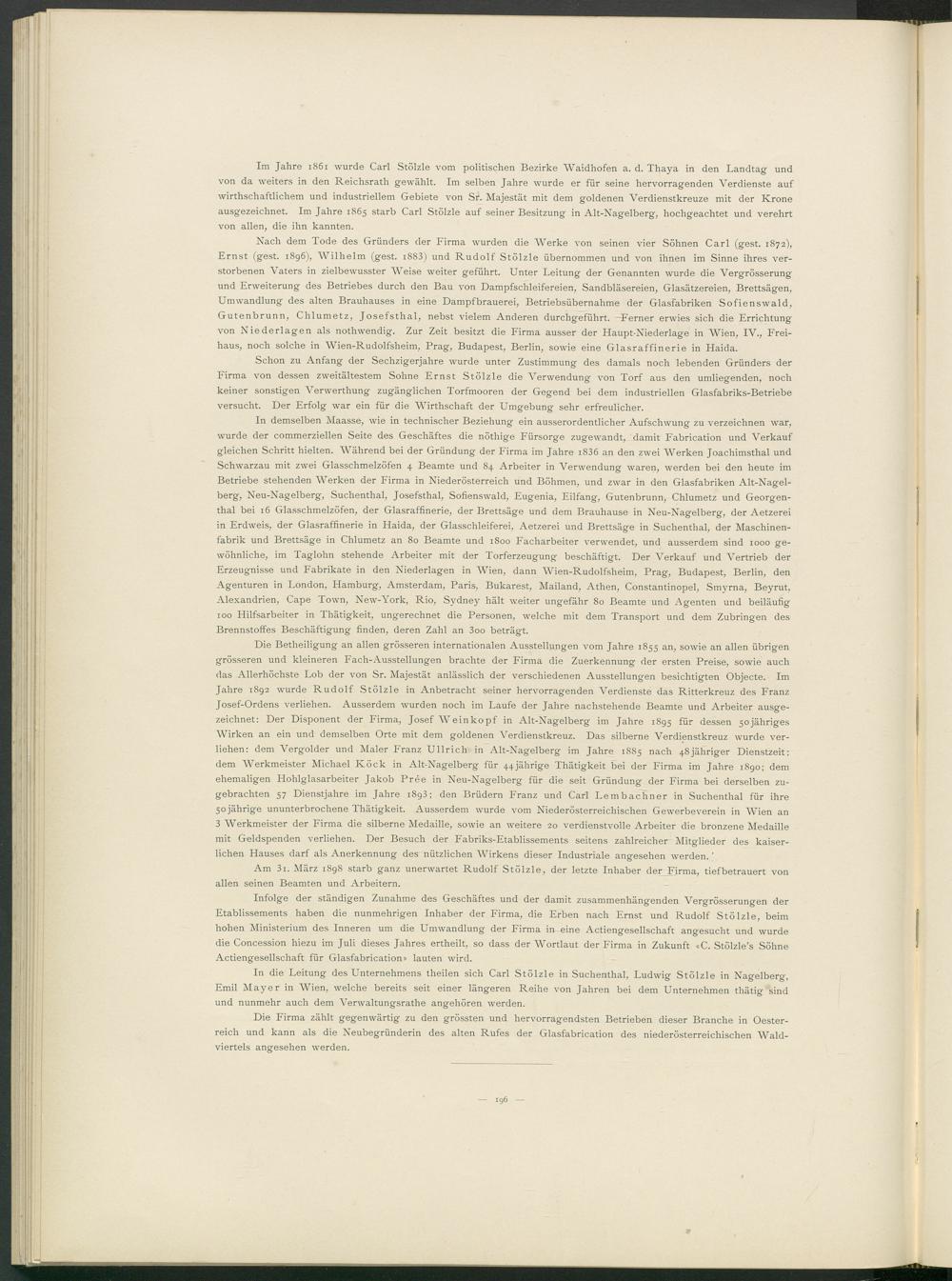 Die Betheiligung an allen grösseren internationalen Ausstellungen vom Jahre 1855 an, sowie an allen übrigen grösseren und kleineren Fach-Ausstellungen brachte der Firma die Zuerkennung der ersten Preise, sowie auch das Allerhöchste Lob der von Sr. Majestät anlässlich der verschiedenen Ausstellungen besichtigten Objecte. Im Jahre 1892 wurde Rudolf Stölzle in Anbetracht seiner hervorragenden Verdienste das Ritterkreuz des Franz Josef-Ordens verliehen. Ausserdem wurden noch im Laufe der Jahre nachstehende Beamte und Arbeiter ausgezeichnet: Der Disponent der Firma, Josef Weinkopf in Alt-Nagelberg im Jahre 1895 für dessen 5ojähriges Wirken an ein und demselben Orte mit dem goldenen Verdienstkreuz. Das silberne Verdienstkreuz wurde verliehen: dem Vergolder und Maler Franz Ullrich in Alt-Nagelberg im Jahre 1885 nach 48jähriger Dienstzeit; dem Werkmeister Michael Köck in Alt-Nagelberg für 44jährige Thätigkeit bei der Firma im Jahre 1890; dem ehemaligen Hohlglasarbeiter Jakob Pree in Neu-Nagelberg für die seit Gründung der Firma bei derselben zugebrachten 57 Dienstjahre im Jahre i8g3; den Brüdern Franz und Carl Lembachner in Suchenthal für ihre 50jährige ununterbrochene Thätigkeit. Ausserdem wurde vom Niederösterreichischen Gewerbeverein in Wien an 3 Werkmeister der Firma die silberne Medaille, sowie an weitere 20 verdienstvolle Arbeiter die bronzene Medaille mit Geldspenden verliehen. Der Besuch der Fabriks-Etablissements seitens zahlreicher Mitglieder des kaiserlichen Hauses darf als Anerkennung des nützlichen Wirkens dieser Industriale angesehen werden. '
