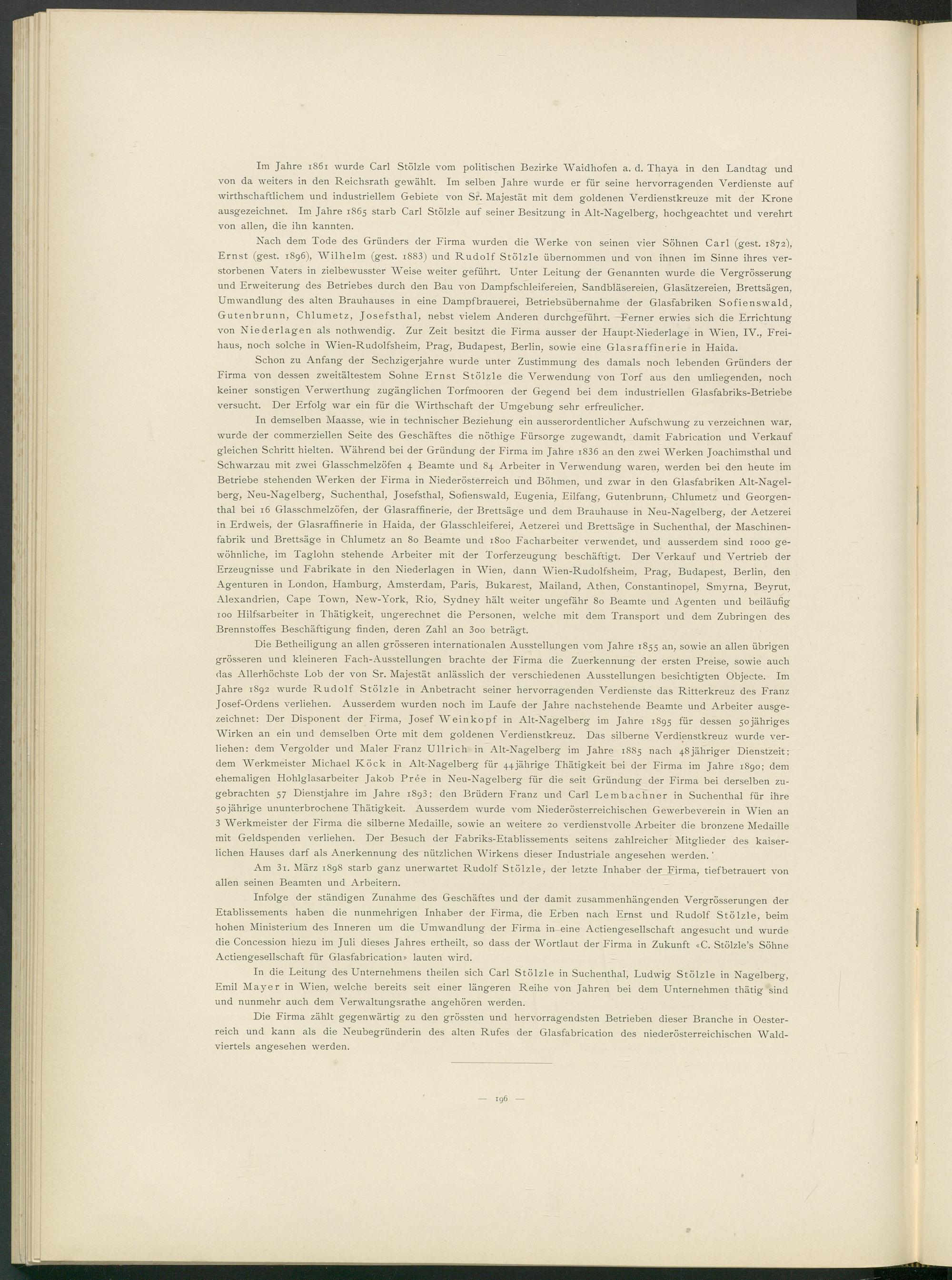 Infolge der ständigen Zunahme des Geschäftes und der damit zusammenhängenden Vergrösserungen der Etablissements haben die nunmehrigen Inhaber der Firma, die Erben nach Ernst und Rudolf Stölzle, beim hohen Ministerium des Inneren um die Umwandlung der Firma in eine Actiengesellschaft angesucht und wurde die Concession hiezu im Juli dieses Jahres ertheilt, so dass der Wortlaut der Firma in Zukunft «C. Stölzle’s Söhne Actiengesellschaft für Glasfabrication» lauten wird.