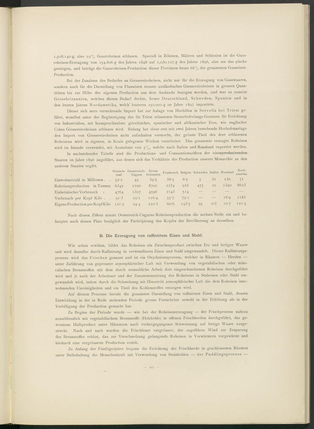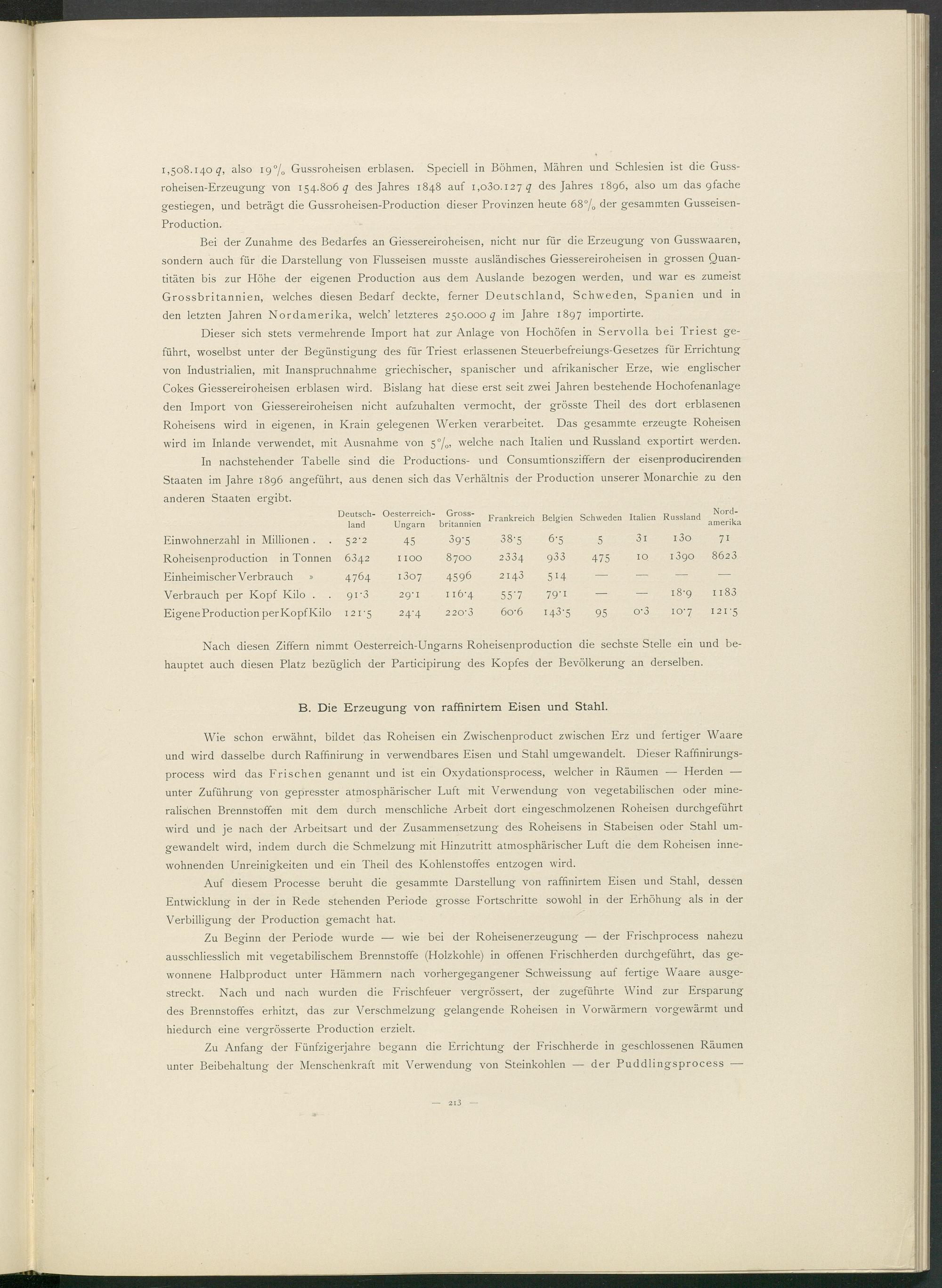 In nachstehender Tabelle sind die Productions- und Consumtionsziffern der eisenproducirenden Staaten im Jahre 1896 angeführt, aus denen sich das Verhältnis der Production unserer Monarchie zu den anderen Staaten ergibt.