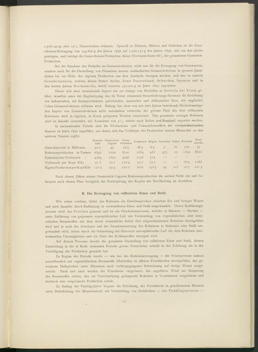 Nach diesen Ziffern nimmt Oesterreich-Ungarns Roheisenproduction die sechste Stelle ein und behauptet auch diesen Platz bezüglich der Participirung des Kopfes der Bevölkerung an derselben.