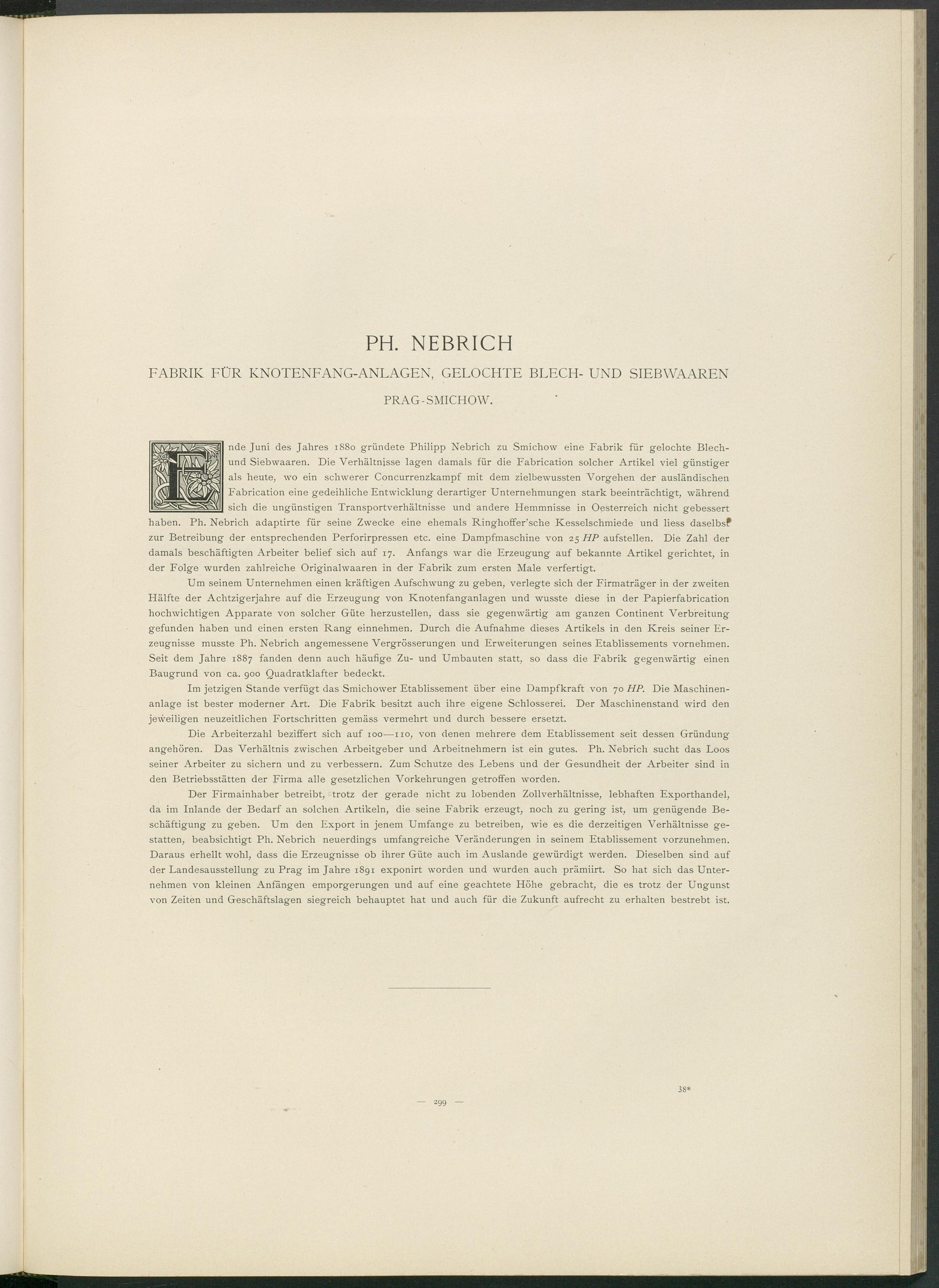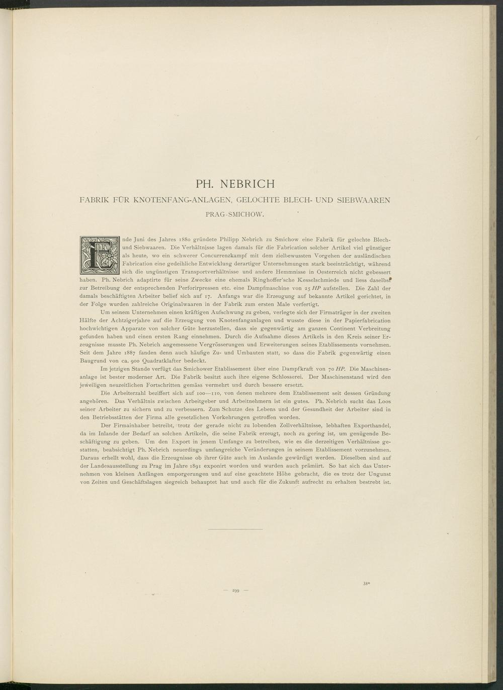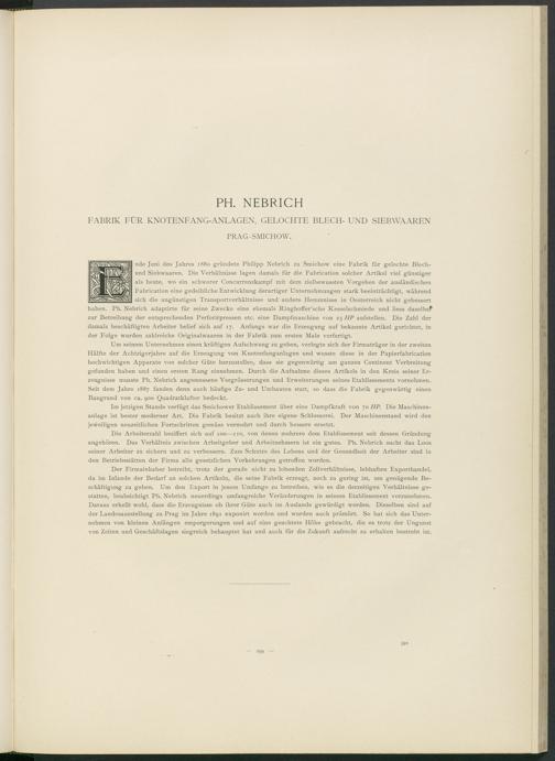 nde Juni des Jahres 1880 gründete Philipp Nebrich zu Smichow eine Fabrik für gelochte Blech- und Siebwaaren. Die Verhältnisse lagen damals für die Fabrication solcher Artikel viel günstiger als heute, wo ein schwerer Concurrenzkampf mit dem zielbewussten Vorgehen der ausländischen Fabrication eine gedeihliche Entwicklung derartiger Unternehmungen stark beeinträchtigt, während sich die ungünstigen Transportverhältnisse und andere Hemmnisse in Oesterreich nicht gebessert haben. Ph. Nebrich adaptirte für seine Zwecke eine ehemals Ringhoffer’sche Kesselschmiede und liess daselbsf zur Betreibung der entsprechenden Perforirpressen etc. eine Dampfmaschine von 25 HP aufstellen. Die Zahl der damals beschäftigten Arbeiter belief sich auf 17. Anfangs war die Erzeugung auf bekannte Artikel gerichtet, in der Folge wurden zahlreiche Originalwaaren in der Fabrik zum ersten Male verfertigt.