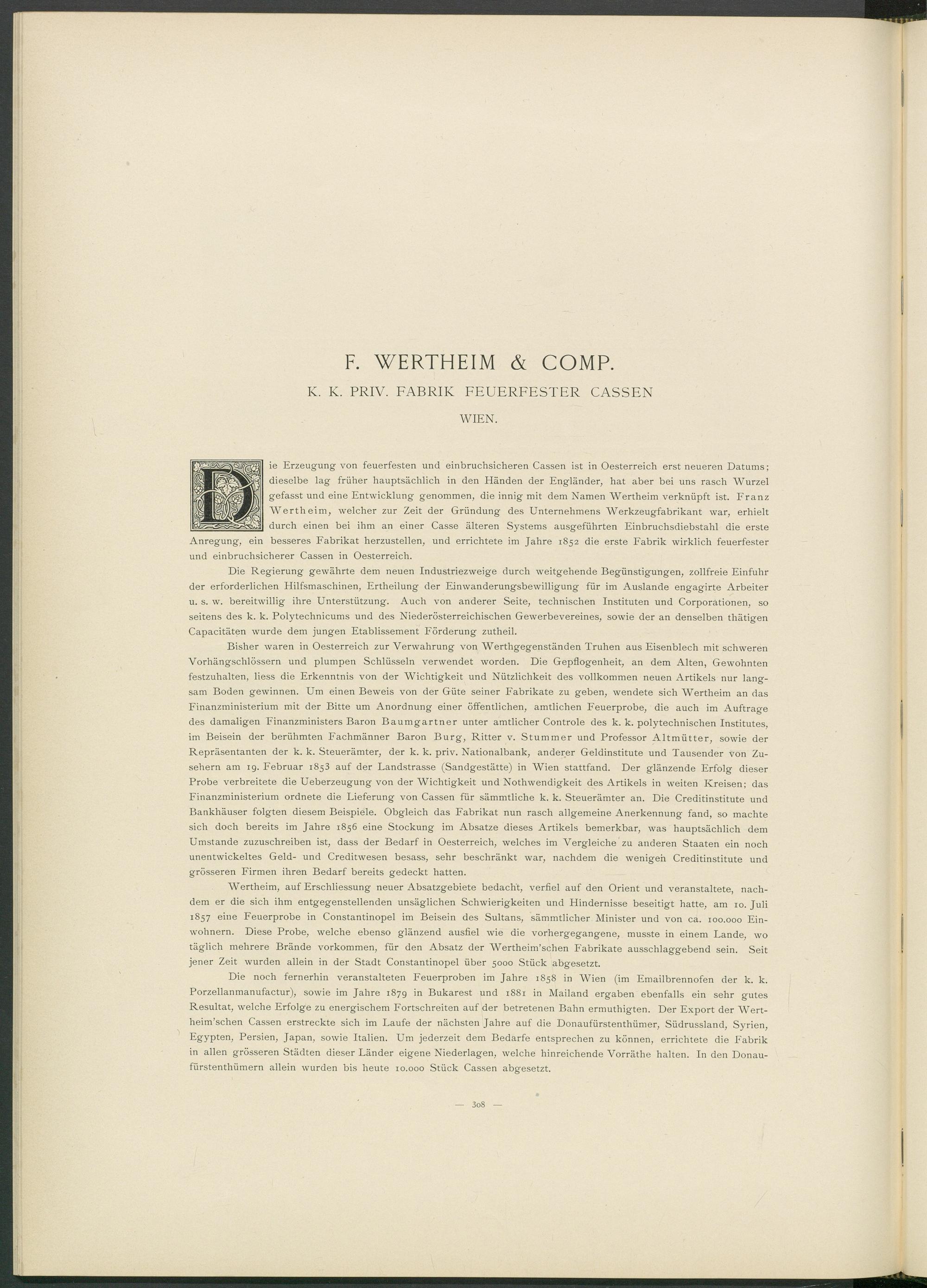 Die noch fernerhin veranstalteten Feuerproben im Jahre 1858 in Wien (im Emailbrennofen der k. k. Porzellanmanufactur), sowie im Jahre 1879 in Bukarest und 1881 in Mailand ergaben ebenfalls ein sehr gutes Resultat, welche Erfolge zu energischem Fortschreiten auf der betretenen Bahn ermuthigten. Der Export der Wertheim’schen Cassen erstreckte sich im Laufe der nächsten Jahre auf die Donaufürstenthümer, Südrussland, Syrien, ^ Egypten, Persien, Japan, sowie Italien. Um jederzeit dem Bedarfe entsprechen zu können, errichtete die Fabrik in allen grösseren Städten dieser Länder eigene Niederlagen, welche hinreichende Vorräthe halten. In den Donau- fürstenthümern allein wurden bis heute 10.000 Stück Cassen abgesetzt.