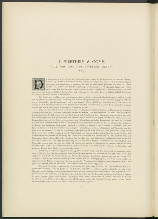 ie Erzeugung von feuerfesten und einbruchsicheren Cassen ist in Oesterreich erst neueren Datums; dieselbe lag früher hauptsächlich in den Händen der Engländer, hat aber bei uns rasch Wurzel gefasst und eine Entwicklung genommen, die innig mit dem Namen Wertheim verknüpft ist. Franz Wertheim, welcher zur Zeit der Gründung des Unternehmens Werkzeugfabrikant war, erhielt durch einen bei ihm an einer Casse älteren Systems ausgeführten Einbruchsdiebstahl die erste Anregung, ein besseres Fabrikat herzustellen, und errichtete im Jahre 1852 die erste Fabrik wirklich feuerfester und einbruchsicherer Cassen in Oesterreich.