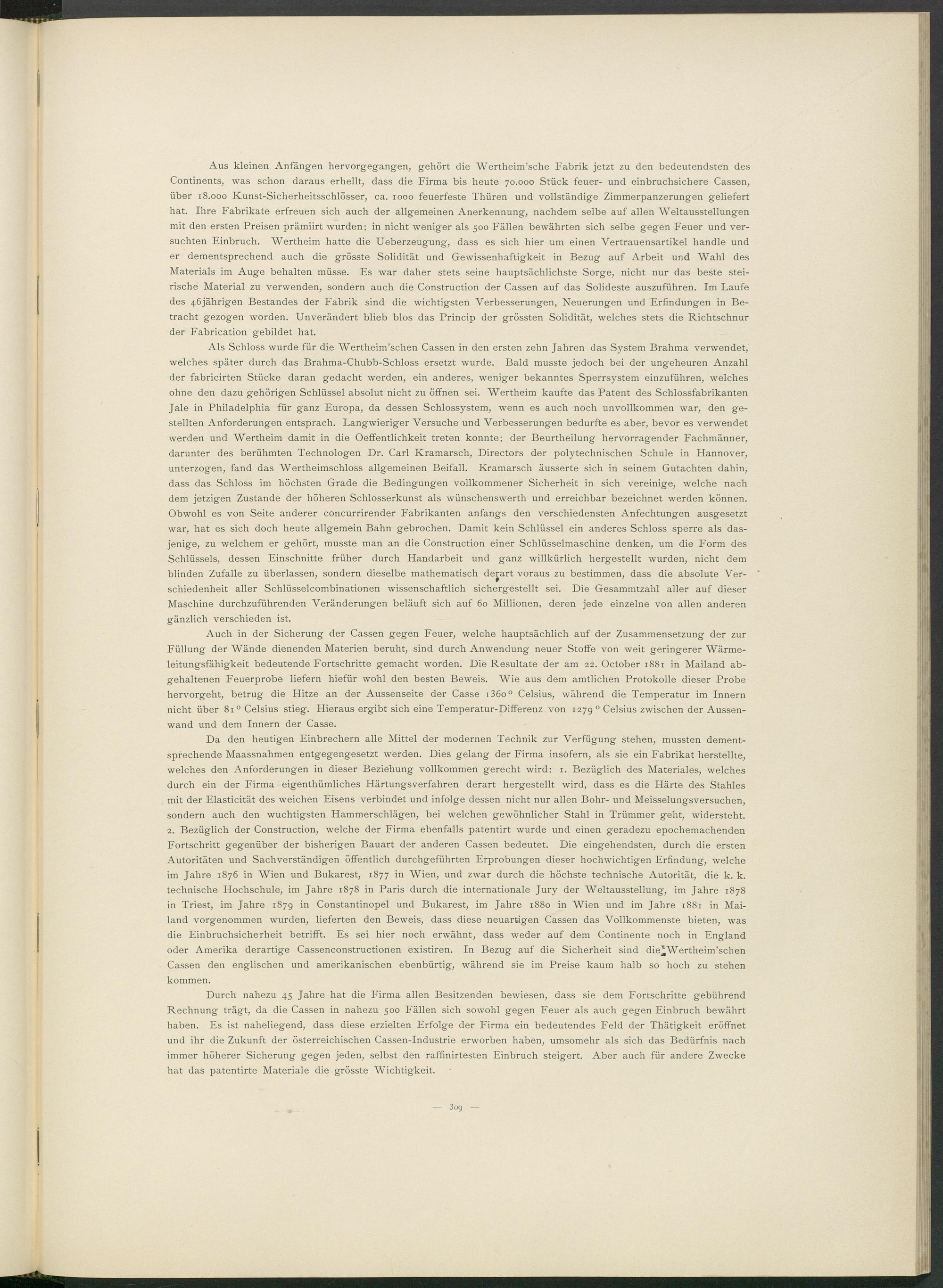 Da den heutigen Einbrechern alle Mittel der modernen Technik zur Verfügung stehen, mussten dementsprechende Maassnahmen entgegengesetzt werden. Dies gelang der Firma insofern, als sie ein Fabrikat herstellte, welches den Anforderungen in dieser Beziehung vollkommen gerecht wird: 1. Bezüglich des Materiales, welches durch ein der Firma eigenthümliches Härtungsverfahren derart hergestellt wird, dass es die Härte des Stahles mit der Elasticität des weichen Eisens verbindet und infolge dessen nicht nur allen Bohr- und Meisselungsversuchen, sondern auch den wuchtigsten Hammerschlägen, bei welchen gewöhnlicher Stahl in Trümmer geht, widersteht. 2. Bezüglich der Construction, welche der Firma ebenfalls patentirt wurde und einen geradezu epochemachenden Fortschritt gegenüber der bisherigen Bauart der anderen Cassen bedeutet. Die eingehendsten, durch die ersten Autoritäten und Sachverständigen öffentlich durchgeführten Erprobungen dieser hochwichtigen Erfindung, welche im Jahre 1876 in Wien und Bukarest, 1877 in Wien, und zwar durch die höchste technische Autorität, die k. k. technische Hochschule, im Jahre 1878 in Paris durch die internationale Jury der Weltausstellung, im Jahre 1878 in Triest, im Jahre 1879 in Constantinopel und Bukarest, im Jahre 1880 in Wien und im Jahre 1881 in Mailand vorgenommen wurden, lieferten den Beweis, dass diese neuartigen Cassen das Vollkommenste bieten, was die Einbruchsicherheit betrifft. Es sei hier noch erwähnt, dass weder auf dem Continente noch in England oder Amerika derartige Cassenconstructionen existiren. In Bezug auf die Sicherheit sind die^Wertheim’schen Cassen den englischen und amerikanischen ebenbürtig, während sie im Preise kaum halb so hoch zu stehen kommen.