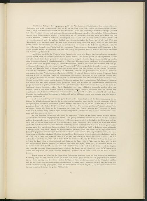 Durch nahezu 45 Jahre hat die Firma allen Besitzenden bewiesen, dass sie dem Fortschritte gebührend Rechnung trägt, da die Cassen in nahezu 500 Fällen sich sowohl gegen Feuer als auch gegen Einbruch bewährt haben. Es ist naheliegend, dass diese erzielten Erfolge der Firma ein bedeutendes Feld der Thätigkeit eröffnet und ihr die Zukunft der österreichischen Cassen-Industrie erworben haben, umsomehr als sich das Bedürfnis nach immer höherer Sicherung gegen jeden, selbst den raffinirtesten Einbruch steigert. Aber auch für andere Zwecke hat das patentirte Materiale die grösste Wichtigkeit.
