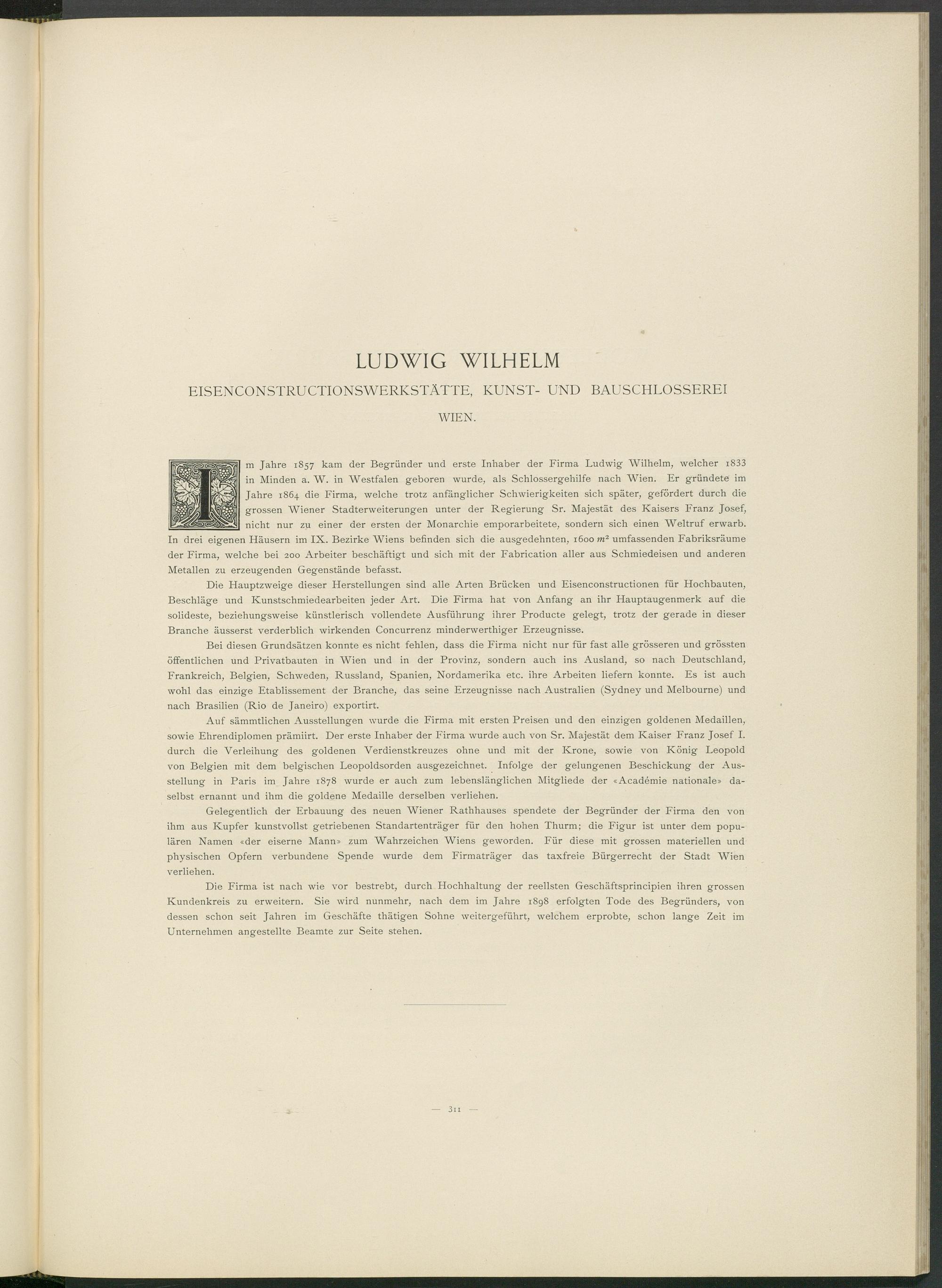 m Jahre 1857 kam der Begründer und erste Inhaber der Firma Ludwig Wilhelm, welcher i833 in Minden a. W. in Westfalen geboren wurde, als Schlossergehilfe nach Wien. Er gründete im Jahre 1864 die Firma, welche trotz anfänglicher Schwierigkeiten sich später, gefördert durch die grossen Wiener Stadterweiterungen unter der Regierung Sr. Majestät des Kaisers Franz Josef, nicht nur zu einer der ersten der Monarchie emporarbeitete, sondern sich einen Weltruf erwarb. In drei eigenen Häusern im IX. Bezirke Wiens befinden sich die ausgedehnten, 1600 m 2 umfassenden Fabriksräume der Firma, welche bei 200 Arbeiter beschäftigt und sich mit der Fabrication aller aus Schmiedeisen und anderen Metallen zu erzeugenden Gegenstände befasst.