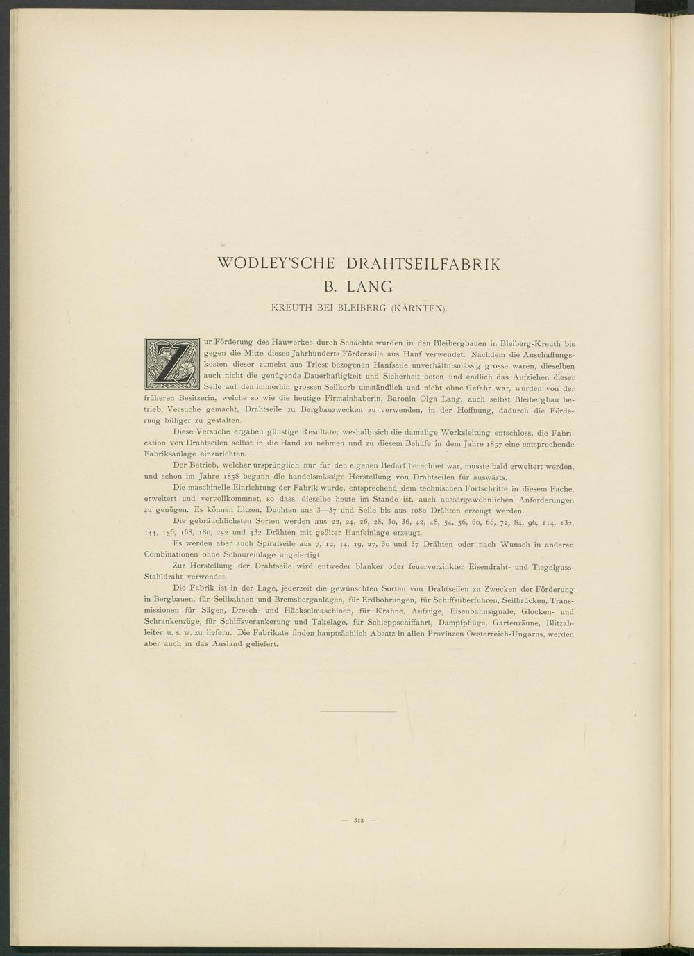 ur Förderung des Hauwerkes durch Schächte wurden in den Bleibergbauen in Bleiberg-Kreuth bis gegen die Mitte dieses Jahrhunderts Förderseile aus Hanf verwendet. Nachdem die Anschaffungskosten dieser zumeist aus Triest bezogenen Hanfseile unverhältnismässig grosse waren, dieselben auch nicht die genügende Dauerhaftigkeit und Sicherheit boten und endlich das Aufziehen dieser Seile auf den immerhin grossen Seilkorb umständlich und nicht ohne Gefahr war, wurden von der früheren Besitzerin, welche so wie die heutige Firmainhaberin, Baronin Olga Lang, auch selbst Bleibergbau betrieb, Versuche gemacht, Drahtseile zu Bergbauzwecken zu verwenden, in der Hoffnung, dadurch die Förderung billiger zu gestalten.