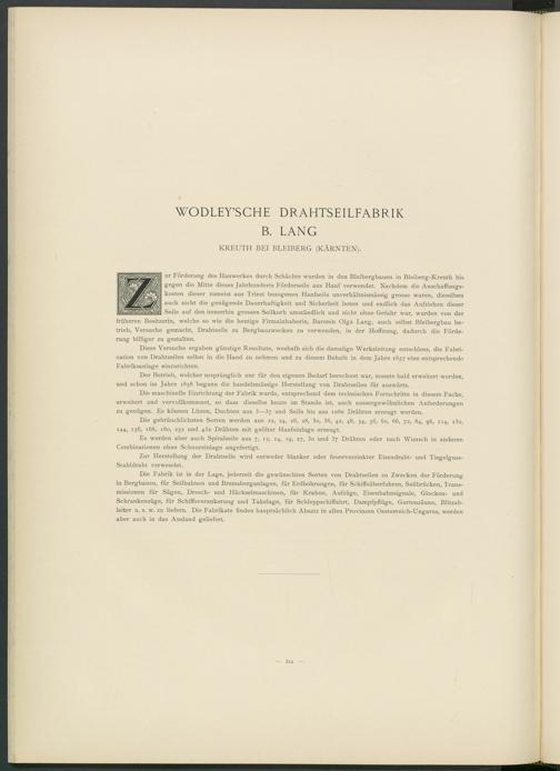 Diese Versuche ergaben günstige Resultate, weshalb sich die damalige Werksleitung entschloss, die Fabri- cation von Drahtseilen selbst in die Hand zu nehmen und zu diesem Behufe in dem Jahre 1857 eine entsprechende Fabriksanlage einzurichten.