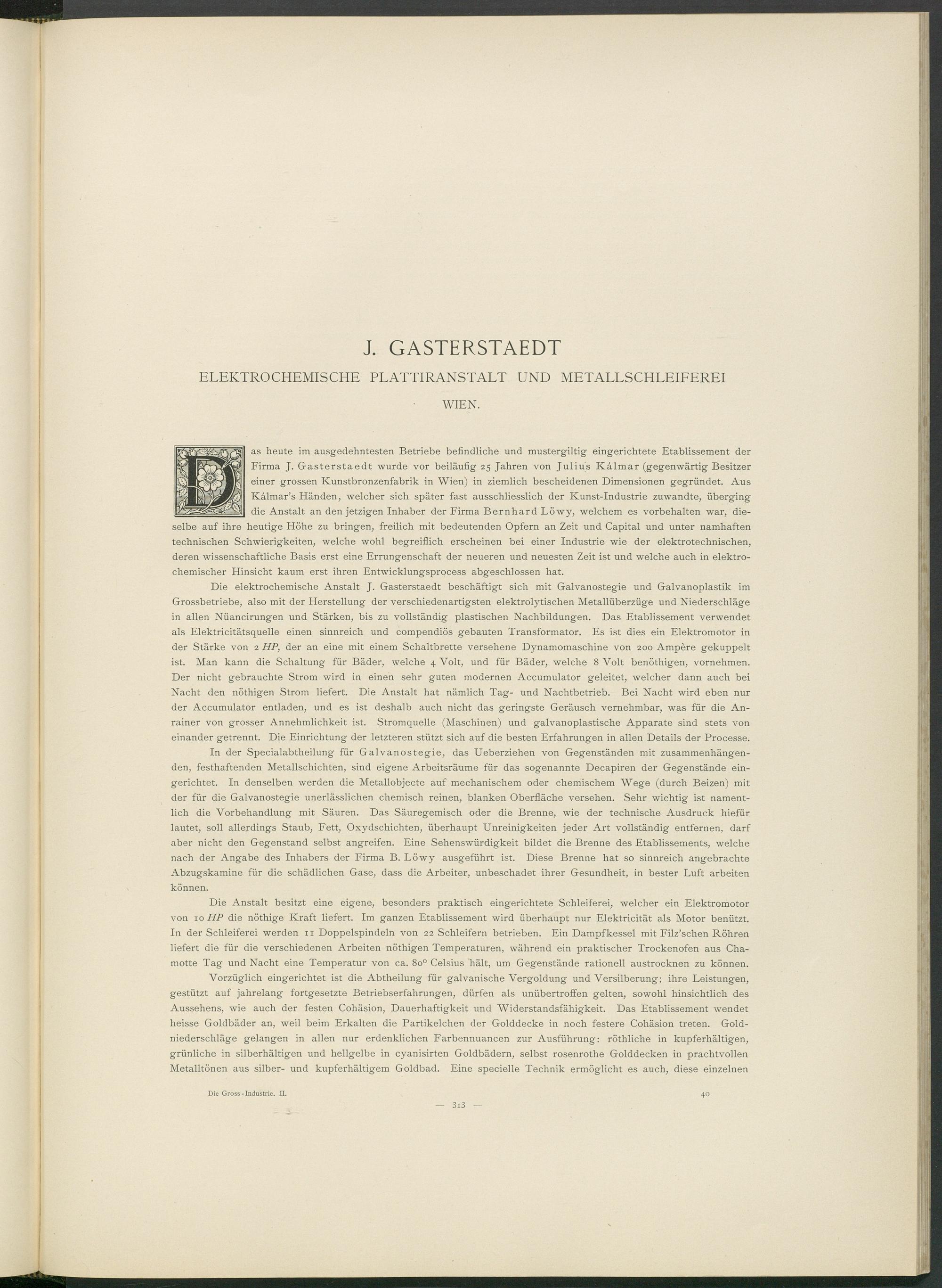 as heute im ausgedehntesten Betriebe befindliche und mustergiltig eingerichtete Etablissement der Firma J. Gasterstaedt wurde vor beiläufig 25 Jahren von Julius Kälmar (gegenwärtig Besitzer einer grossen Kunstbronzenfabrik in Wien) in ziemlich bescheidenen Dimensionen gegründet. Aus Kälmar’s Händen, welcher sich später fast ausschliesslich der Kunst-Industrie zuwandte, überging die Anstalt an den jetzigen Inhaber der Firma Bernhard Löwy, welchem es Vorbehalten war, dieselbe auf ihre heutige Höhe zu bringen, freilich mit bedeutenden Opfern an Zeit und Capital und unter namhaften technischen Schwierigkeiten, welche wohl begreiflich erscheinen bei einer Industrie wie der elektrotechnischen, deren wissenschaftliche Basis erst eine Errungenschaft der neueren und neuesten Zeit ist und welche auch in elektrochemischer Hinsicht kaum erst ihren Entwicklungsprocess abgeschlossen hat.