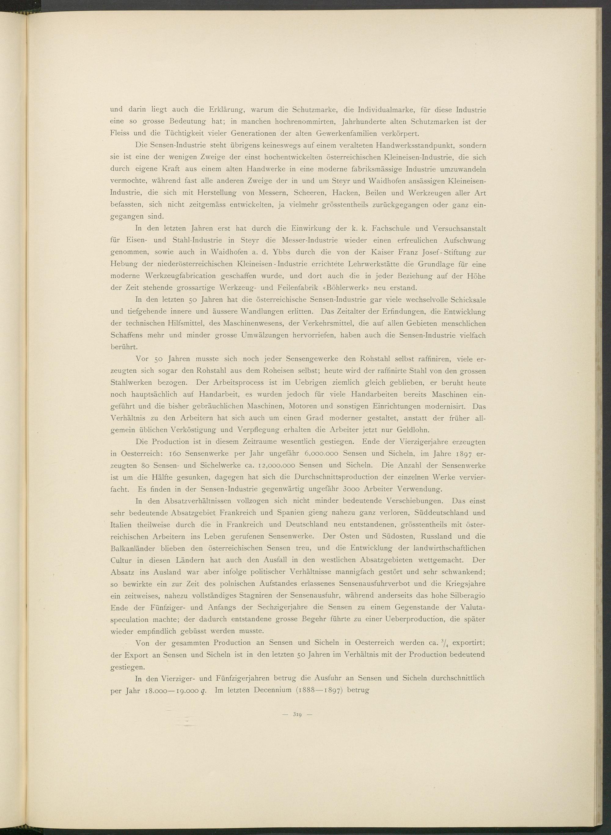 Die Sensen-Industrie steht übrigens keineswegs auf einem veralteten Handwerksstandpunkt, sondern sie ist eine der wenigen Zweige der einst hochentwickelten österreichischen Kleineisen-Industrie, die sich durch eigene Kraft aus einem alten Handwerke in eine moderne fabriksmässige Industrie umzuwandeln vermochte, während fast alle anderen Zweige der in und um Steyr und Waidhofen ansässigen Kleineisen- Industrie, die sich mit Herstellung von Messern, Scheeren, Hacken, Beilen und Werkzeugen aller Art befassten, sich nicht zeitgemäss entwickelten, ja vielmehr grösstentheils zurückgegangen oder ganz eingegangen sind.