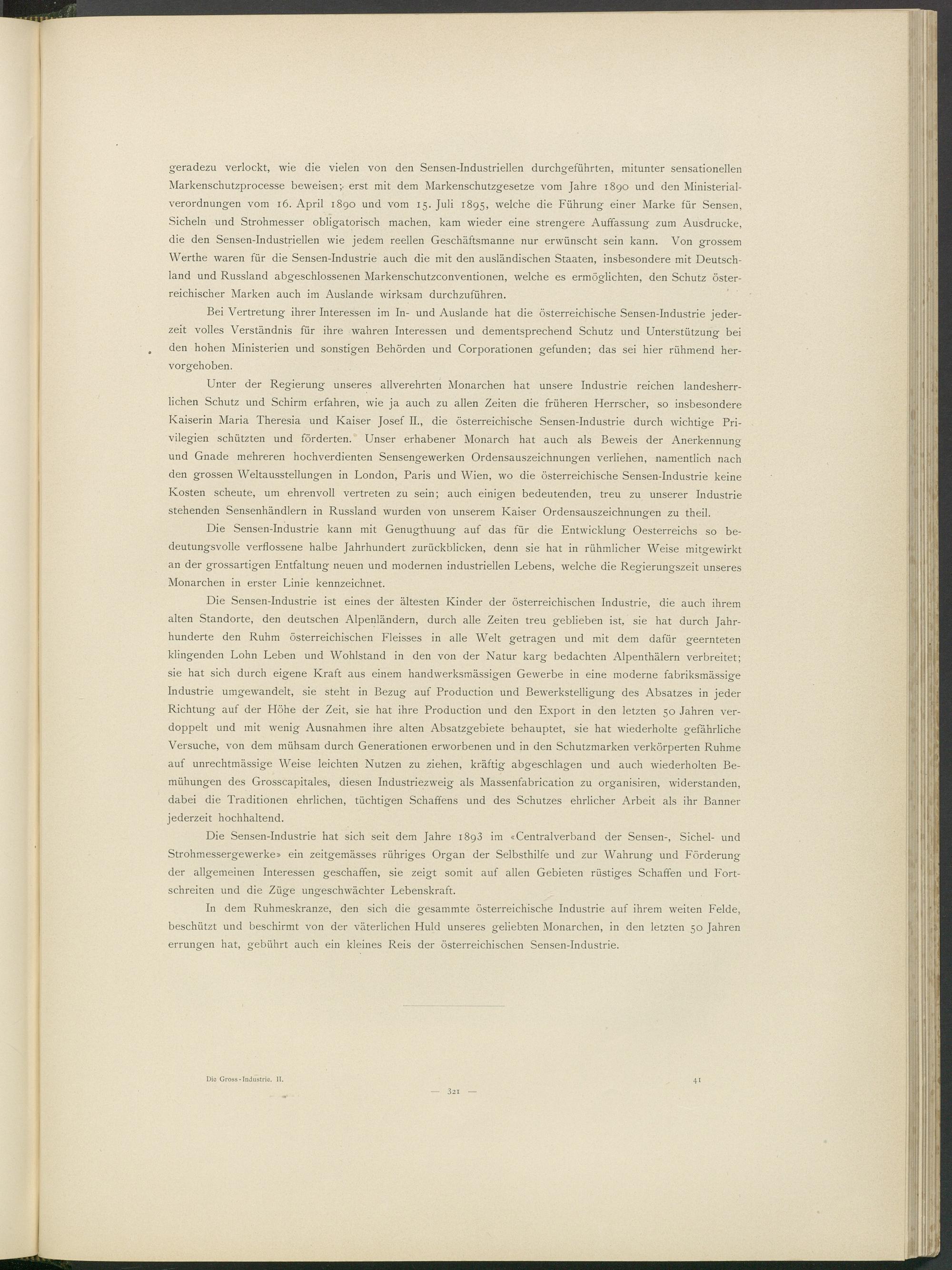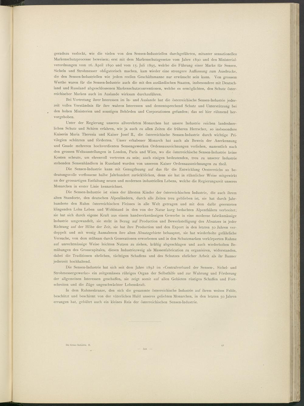 Die Sensen-Industrie ist eines der ältesten Kinder der österreichischen Industrie, die auch ihrem alten Standorte, den deutschen Alpenländern, durch alle Zeiten treu geblieben ist, sie hat durch Jahrhunderte den Ruhm österreichischen Fleisses in alle Welt getragen und mit dem dafür geernteten klingenden Lohn Leben und Wohlstand in den von der Natur karg bedachten Alpenthälern verbreitet; sie hat sich durch eigene Kraft aus einem handwerksmässigen Gewerbe in eine moderne fabriksmässige Industrie umgewandelt, sie steht in Bezug auf Production und Bewerkstelligung des Absatzes in jeder Richtung auf der Höhe der Zeit, sie hat ihre Production und den Export in den letzten 50 Jahren verdoppelt und mit wenig Ausnahmen ihre alten Absatzgebiete behauptet, sie hat wiederholte gefährliche Versuche, von dem mühsam durch Generationen erworbenen und in den Schutzmarken verkörperten Ruhme auf unrechtmässige Weise leichten Nutzen zu ziehen, kräftig abgeschlagen und auch wiederholten Bemühungen des Grosscapitales, diesen Industriezweig als Massenfabrication zu organisiren, widerstanden, dabei die Traditionen ehrlichen, tüchtigen Schaffens und des Schutzes ehrlicher Arbeit als ihr Banner jederzeit hochhaltend.