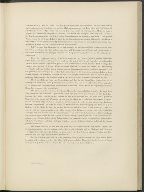 Unter der Regierung unseres allverehrten Monarchen hat unsere Industrie reichen landesherrlichen Schutz und Schirm erfahren, wie ja auch zu allen Zeiten die früheren Herrscher, so insbesondere Kaiserin Maria Theresia und Kaiser Josef II., die österreichische Sensen-Industrie durch wichtige Privilegien schützten und förderten. Unser erhabener Monarch hat auch als Beweis der Anerkennung und Gnade mehreren hochverdienten Sensengewerken Ordensauszeichnungen verliehen, namentlich nach den grossen Weltausstellungen in London, Paris und Wien, wo die österreichische Sensen-Industrie keine Kosten scheute, um ehrenvoll vertreten zu sein; auch einigen bedeutenden, treu zu unserer Industrie stehenden Sensenhändlern in Russland wurden von unserem Kaiser Ordensauszeichnungen zu theil.