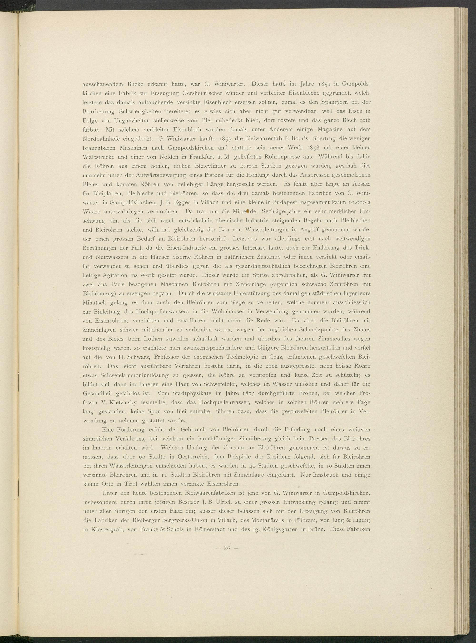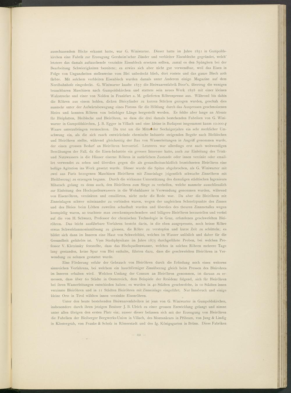 ausschauendem Blicke erkannt hatte, war G. Winiwarter. Dieser hatte im Jahre 1851 in Gumpoldskirchen eine Fabrik zur Erzeugung Gersheim’scher Zünder und verbleiter Eisenbleche gegründet, welch’ letztere das damals auftauchende verzinkte Eisenblech ersetzen sollten, zumal es den Spänglern bei der Bearbeitung Schwierigkeiten bereitete; es erwies sich aber nicht gut verwendbar, weil das Eisen in Folge von Unganzheiten stellenweise vom Blei unbedeckt blieb, dort rostete und das ganze Blech roth färbte. Mit solchem verbleiten Eisenblech wurden damals unter Anderem einige Magazine auf dem Nordbahnhofe eingedeckt. G. Winiwarter kaufte 1857 die Bleiwaarenfabrik Boor’s, übertrug die wenigen brauchbaren Maschinen nach Gumpoldskirchen und stattete sein neues Werk 1858 mit einer kleinen Walzstrecke und einer von Nolden in Frankfurt a. M. gelieferten Röhrenpresse aus. Während bis dahin die Röhren aus einem hohlen, dicken Bleicylinder zu kurzen Stücken gezogen wurden, geschah dies nunmehr unter der Aufwärtsbewegung eines Pistons für die Höhlung durch das Auspressen geschmolzenen Bleies und konnten Röhren von beliebiger Länge hergestellt werden. Es fehlte aber lange an Absatz für Bleiplatten, Bleibleche und Bleiröhren, so dass die drei damals bestehenden Fabriken von G. Winiwarter in Gumpoldskirchen, J. B. Egger in Villach und eine kleine in Budapest insgesammt kaum 10.000 q Waare unterzubringen vermochten. Da trat um die Mitteider Sechzigerjahre ein sehr merklicher Umschwung ein, als die sich rasch entwickelnde chemische Industrie steigenden Begehr nach Bleiblechen und Bleiröhren stellte, während gleichzeitig der Bau von Wasserleitungen in Angriff genommen wurde, der einen grossen Bedarf an Bleiröhren hervorrief. Letzteres war allerdings erst nach weitwendigen Bemühungen der Fall, da die Eisen-Industrie ein grosses Interesse hatte, auch zur Einleitung des Trink- und Nutzwassers in die Häuser eiserne Röhren in natürlichem Zustande oder innen verzinkt oder email- lirt verwendet zu sehen und überdies gegen die als gesundheitsschädlich bezeichneten Bleiröhren eine heftige Agitation ins Werk gesetzt wurde. Dieser wurde die Spitze abgebrochen, als G. Winiwarter mit zwei aus Paris bezogenen Maschinen Bleiröhren mit Zinneinlage (eigentlich schwache Zinnröhren mit Bleiüberzug) zu erzeugen begann. Durch die wirksame Unterstützung des damaligen städtischen Ingenieurs Mihatsch gelang es denn auch, den Bleiröhren zum Siege zu verhelfen, welche nunmehr ausschliesslich zur Einleitung des Hochquellenwassers in die Wohnhäuser in Verwendung genommen wurden, während von Eisenröhren, verzinkten und emaillirten, nicht mehr die Rede war. Da aber die Bleiröhren mit Zinneinlagen schwer miteinander zu verbinden waren, wegen der ungleichen Schmelzpunkte des Zinnes und des Bleies beim Löthen zuweilen schadhaft wurden und überdies des theuren Zinnmetalles wegen kostspielig waren, so trachtete man zweckentsprechendere und billigere Bleiröhren herzustellen und verfiel auf die von H. Schwarz, Professor der chemischen Technologie in Graz, erfundenen geschwefelten Bleiröhren. Das leicht ausführbare Verfahren besteht darin, in die eben ausgepresste, noch heisse Röhre etwas Schwefelammoniumlösung zu giessen, die Röhre zu verstopfen und kurze Zeit zu schütteln; es bildet sich dann im Inneren eine Haut von Schwefelblei, welches im Wasser unlöslich und daher für die Gesundheit gefahrlos ist. Vom Stadtphysikate im Jahre 1875 durchgeführte Proben, bei welchen Professor V. Kletzinsky feststellte, dass das Hochquellenwasser, welches in solchen Röhren mehrere Tage lang gestanden, keine Spur von Blei enthalte, führten dazu, dass die geschwefelten Bleiröhren in Verwendung zu nehmen gestattet wurde.