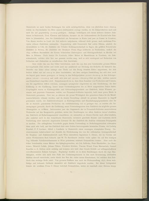 Aber weder das aus den früher betriebenen, noch das aus den jetzt bestehenden grossen Hütten hervorgehende Zink reichte und reicht auch nur annähernd zur Deckung des Bedarfes der Industrie hin. Dieselbe war daher schon anfangs zum Theile auf den Bezug fremden Zinkes angewiesen, der sich freilich früher nur auf 2000 q im Jahre beschränkte; mit ihrer stetigen Entwicklung hat sich aber auch der Import ganz enorm gesteigert; er betrug in den Siebzigerjahren 50.000—60.000 q, in den Achtzigerjahren 100.000 — 120.000 g und stellt sich jetzt auf 150.000—160.000 g Zink per Jahr, welches zumeist aus Deutschland eingeführt wird. Bemerkenswerth ist es, dass diese Zunahme von Production und Consum, wie die angeführten Ziffern erweisen, sozusagen sprungweise eingetreten ist, eine Erscheinung, die ihre Erklärung in der Einführung immer neuer Verwendungsarten des zu Blech ausgewalzten Zinkes findet. Ursprünglich waren es Küchengeräthe und Gebrauchsgegenstände aus Zinkblech, kleine Wannen, gestanzte und gepresste Ornamente, welche, aus Preussisch-Schlesien importirt, bald einen guten Markt in Oesterreich gewannen. Dort war zu allererst die grosse Wichtigkeit des gewalzten Zinkes für die Metall- waaren-Industrie erkannt worden, und da dessen Darstellung alsbald im grossen Maasstabe in Angriff genommen wurde, der Zinkblechverbrauch zu Küchengeräthen und Haushaltungsgegenständen aber für die in Aussicht genommene Production ein verhältnismässig viel zu geringer war, so wurden alle Anstrengungen gemacht, durch die Einführung neuer Verwendungsarten dem Zinkblech ein möglichst grosses Absatzgebiet zu eröffnen. Insbesondere war das Augenmerk der in Preussisch-Schlesien neuerrichteten AA^alzwerke auf das Baugewerbe gerichtet, wobei ihre Bemühungen vor allem Anderen darauf abzielten, das Zinkblech als Bedachungsmaterial einzuführen; sie entsandten zu diesem Zwecke nach allen Ländern, also zunächst auch in das benachbarte Oesterreich, technisch geschulte Beamte und trachteten durch Verbreitung einer instructiv abgefassten Literatur für das Zinkblech die denkbar wirksamste Propaganda zu machen. Die anfänglichen Vorurtheile gegen dessen Verwendung zu Bedachungszwecken schwanden denn auch sehr bald, und das Zinkblech hielt unter Zuthun hervorragender heimischer Firmen, wie Ludwig Kuschel, F. P. Lechner, Alfred v. Lindheim in Oesterreich einen sozusagen triumphalen Einzug. Ge- wissermaassen bahnbrechend war diesfalls die Niederlassung des von der schlesischen Actiengesellschaft für Bergbau- und Zinkhüttenbetrieb nach Wien entsendeten Ingenieurs C. Diener, der im Vereine mit seinen AAArkmeistern Rud. Geburth und W. Th. Burckhardt (welche beide später bis auf den heutigen Tag blühende Fabriksetablissements in Wien gründeten) wahrhaft Erstaunliches leistete. Aber auch die früher bestehenden ersten Meister des Spänglergewerbes, wie Joh. Schlerka, Peter Hassfurther, Jos. Russ- leitner, Heinrich Lefnär, Johann Führer, Friedrich Schober, Vincenz Wenzl, Franz Marouschek, Samuel Kaschka u. A. blieben nicht unthätig und konnten sich bald ohne fremde Beihilfe auf selbstgeschaffenen vervollkommneten Bahnen bewegen. Begünstigt wurden sie in ihren Bemühungen durch die rege Bau- thätigkeit, welche sich nach dem Falle der Umfassungsmauern in den nach Erweiterung strebenden Städten überall entwickelte, sowie durch den Bau der vielen neuen Eisenbahnen, bei welchen dem Zinkblech eine wichtige Rolle zufiel. Von grossem Einflüsse war auch die AVeltausstellung 1873, deren weitläufige und kolossale Gebäude sämmtlich mit Zinkblech eingedeckt wurden. Bei dieser Gelegenheit leistete die erwähnte Firma C. Diener wahrhaft Erstaunliches, indem sie innerhalb einer überaus knapp