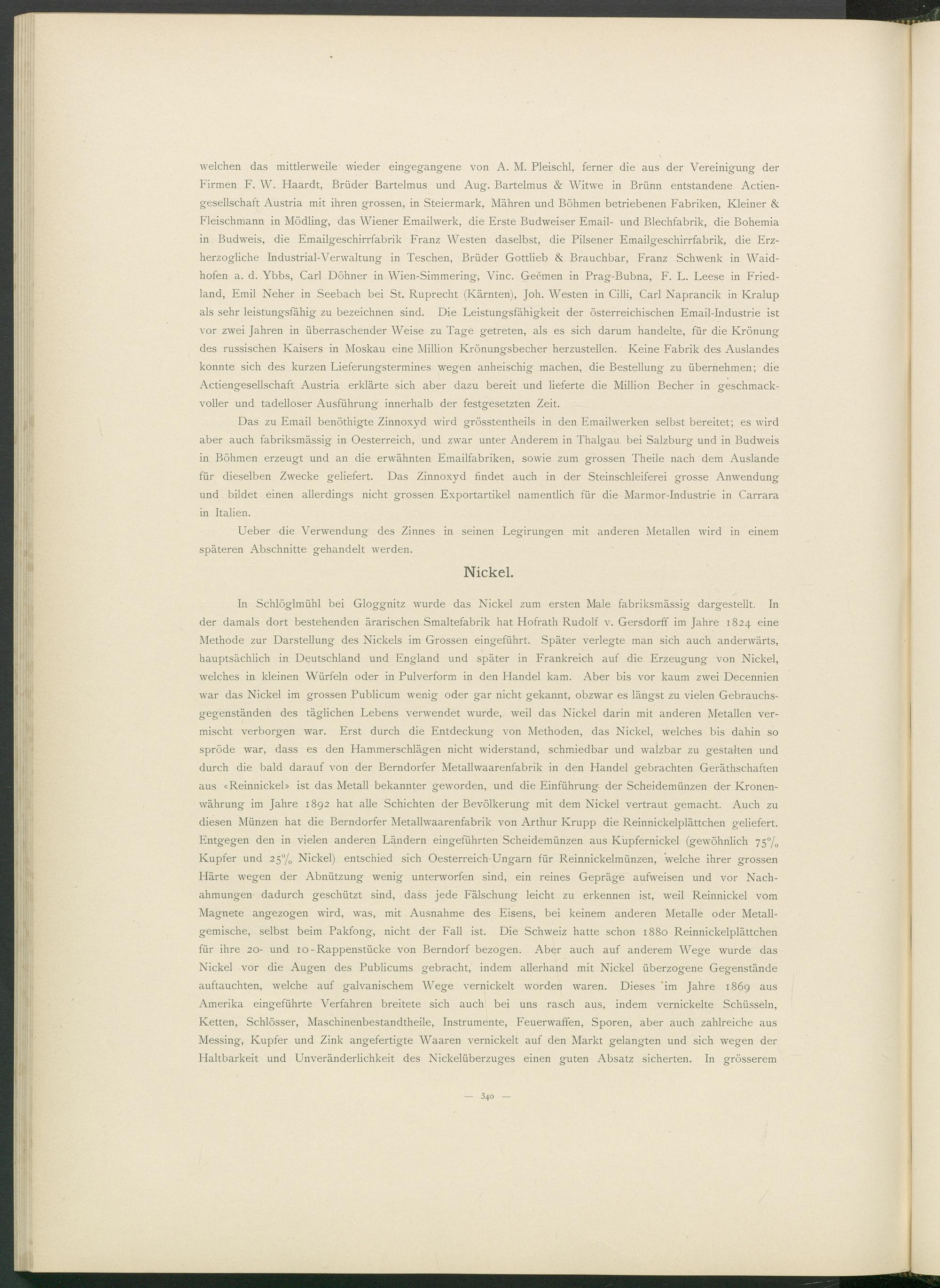 In Schlöglmühl bei Gloggnitz wurde das Nickel zum ersten Male fabriksmässig dargestellt. In der damals dort bestehenden ärarischen Smaltefabrik hat Hofrath Rudolf v. Gersdorff im Jahre 1824 eine Methode zur Darstellung des Nickels im Grossen eingeführt. Später verlegte man sich auch anderwärts, hauptsächlich in Deutschland und England und später in Frankreich auf die Erzeugung von Nickel, welches in kleinen Würfeln oder in Pulverform in den Handel kam. Aber bis vor kaum zwei Decennien war das Nickel im grossen Publicum wenig oder gar nicht gekannt, obzwar es längst zu vielen Gebrauchsgegenständen des täglichen Lebens verwendet wurde, weil das Nickel darin mit anderen Metallen vermischt verborgen war. Erst durch die Entdeckung von Methoden, das Nickel, welches bis dahin so spröde war, dass es den Hammerschlägen nicht widerstand, schmiedbar und walzbar zu gestalten und durch die bald darauf von der Berndorfer Metallwaarenfabrik in den Handel gebrachten Gerätschaften aus «Reinnickel» ist das Metall bekannter geworden, und die Einführung der Scheidemünzen der Kronenwährung im Jahre 1892 hat alle Schichten der Bevölkerung mit dem Nickel vertraut gemacht. Auch zu diesen Münzen hat die Berndorfer Metallwaarenfabrik von Arthur Krupp die Reinnickelplättchen geliefert. Entgegen den in vielen anderen Ländern eingeführten Scheidemünzen aus Kupfernickel (gewöhnlich 75% Kupfer und 2 5°/ 0 Nickel) entschied sich Oesterreich-Ungarn für Reinnickelmünzen, welche ihrer grossen Härte wegen der Abnützung wenig unterworfen sind, ein reines Gepräge aufweisen und vor Nachahmungen dadurch geschützt sind, dass jede Fälschung leicht zu erkennen ist, weil Reinnickel vom Magnete angezogen wird, was, mit Ausnahme des Eisens, bei keinem anderen Metalle oder Metallgemische, selbst beim Pakfong, nicht der Fall ist. Die Schweiz hatte schon 1880 Reinnickelplättchen für ihre 20- und 10 - Rappenstücke von Berndorf bezogen. Aber auch auf anderem Wege wurde das Nickel vor die Augen des Publicums gebracht, indem allerhand mit Nickel überzogene Gegenstände auftauchten, welche auf galvanischem Wege vernickelt worden waren. Dieses 'im Jahre 1869 aus Amerika eingeführte Verfahren breitete sich auch bei uns rasch aus, indem vernickelte Schüsseln, Ketten, Schlösser, Maschinenbestandtheile, Instrumente, Feuerwaffen, Sporen, aber auch zahlreiche aus Messing, Kupfer und Zink angefertigte Waaren vernickelt auf den Markt gelangten und sich wegen der Haltbarkeit und Unveränderlichkeit des Nickelüberzuges einen guten Absatz sicherten. In grösserem