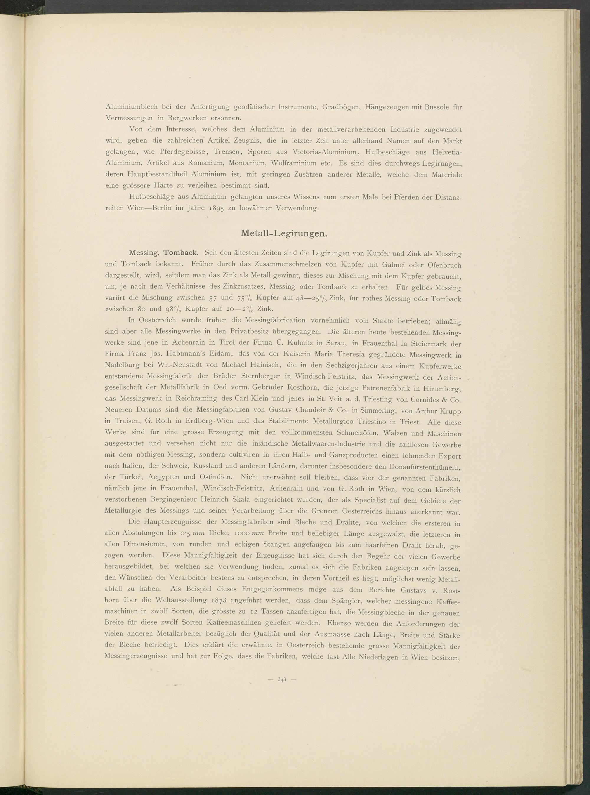 In Oesterreich wurde früher die Messingfabrication vornehmlich vom Staate betrieben; allmälig sind aber alle Messingwerke in den Privatbesitz übergegangen. Die älteren heute bestehenden Messingwerke sind jene in Achenrain in Tirol der Firma C. Kulmitz in Sarau, in Frauenthal in Steiermark der Firma Franz Jos. Habtmann’s Eidam, das von der Kaiserin Maria Theresia gegründete Messingwerk in Nadelburg bei Wr.-Neustadt von Michael Hainisch, die in den Sechzigerjahren aus einem Kupferwerke entstandene Messingfabrik der Brüder Sternberger in Windisch-Feistritz, das Messingwerk der Actien- gesellschaft der Metallfabrik in Oed vorm. Gebrüder Rosthorn, die jetzige Patronenfabrik in Hirtenberg, das Messingwerk in Reichraming des Carl Klein und jenes in St. Veit a. d. Triesting von Cornides & Co. Neueren Datums sind die Messingfabriken von Gustav Chaudoir & Co. in Simmering, von Arthur Krupp in Traisen, G. Roth in Erdberg-Wien und das Stabilimento Metallurgico Triestino in Triest. Alle diese Werke sind für eine grosse Erzeugung mit den vollkommensten Schmelzöfen, Walzen und Maschinen ausgestattet und versehen nicht nur die inländische Metallwaaren-Industrie und die zahllosen Gewerbe mit dem nöthigen Messing, sondern cultiviren in ihren Halb- und Ganzproducten einen lohnenden Export nach Italien, der Schweiz, Russland und anderen Ländern, darunter insbesondere den Donaufürstenthümern, der Türkei, Aegypten und Ostindien. Nicht unerwähnt soll bleiben, dass vier der genannten Fabriken, nämlich jene in Frauenthal, Windisch-Feistritz, Achenrain und von G. Roth in Wien, von dem kürzlich verstorbenen Bergingenieur Heinrich Skala eingerichtet wurden, der als Specialist auf dem Gebiete der Metallurgie des Messings und seiner Verarbeitung über die Grenzen Oesterreichs hinaus anerkannt war.