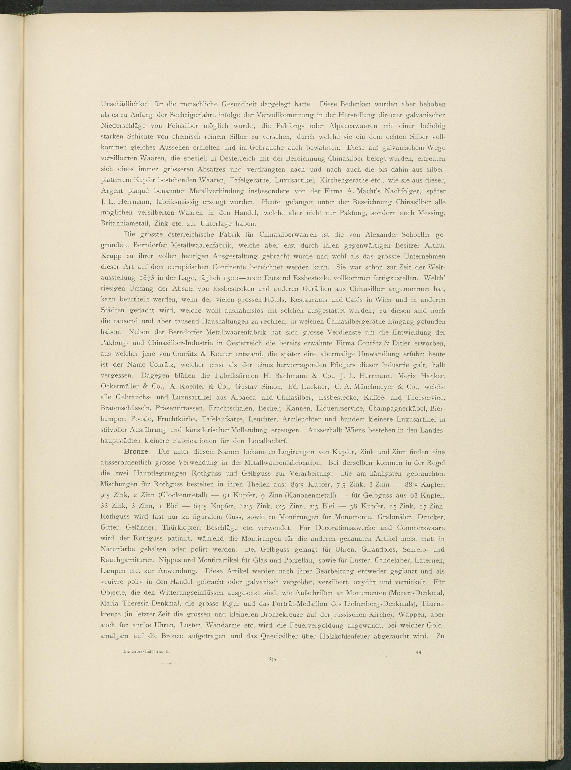 Die grösste österreichische Fabrik für Chinasilberwaaren ist die von Alexander Schoeller gegründete Berndorfer Metallwaarenfabrik, welche aber erst durch ihren gegenwärtigen Besitzer Arthur Krupp zu ihrer vollen heutigen Ausgestaltung gebracht wurde und wohl als das grösste Unternehmen dieser Art auf dem europäischen Continente bezeichnet werden kann. Sie war schon zur Zeit der Weltausstellung 1873 in der Lage, täglich 1500—2000 Dutzend Essbestecke vollkommen fertigzustellen. Welch’ riesigen Umfang der Absatz von Essbestecken und anderen Geräthen aus Chinasilber angenommen hat, kann beurtheilt werden, wenn der vielen grossen Hotels, Restaurants und Cafés in Wien und in anderen Städten gedacht wird, welche wohl ausnahmslos mit solchen ausgestattet wurden; zu diesen sind noch die tausend und aber tausend Haushaltungen zu rechnen, in welchen Chinasilbergeräthe Eingang gefunden haben. Neben der Berndorfer Metallwaarenfabrik hat sich grosse Verdienste um die Entwicklung der Pakfong- und Chinasilber-Industrie in Oesterreich die bereits erwähnte Firma Conrätz & Ditler erworben, aus welcher jene von Conrätz & Reuter entstand, die später eine abermalige Umwandlung erfuhr; heute ist der Name Conrätz, welcher einst als der eines hervorragenden Pflegers dieser Industrie galt, halb vergessen. Dagegen blühen die Fabriksfirmen H. Bachmann & Co., J. L. Herrmann, Moriz Hacker, Ockermüller & Co., A. Koehler & Co., Gustav Simon, Ed. Lackner, C. A. Münchmeyer & Co., welche alle Gebrauchs- und Luxusartikel aus Alpacca und Chinasilber, Essbestecke, Kaffee- und Theeservice, Bratenschüsseln, Präsentirtassen, Fruchtschalen, Becher, Kannen, Liqueurservice, Champagnerkübel, Bierhumpen, Pocale, Fruchtkörbe, Tafelaufsätze, Leuchter, Armleuchter und hundert kleinere Luxusartikel in stilvoller Ausführung und künstlerischer Vollendung erzeugen. Ausserhalb Wiens bestehen in den Landeshauptstädten kleinere Fabricationen für den Localbedarf.
