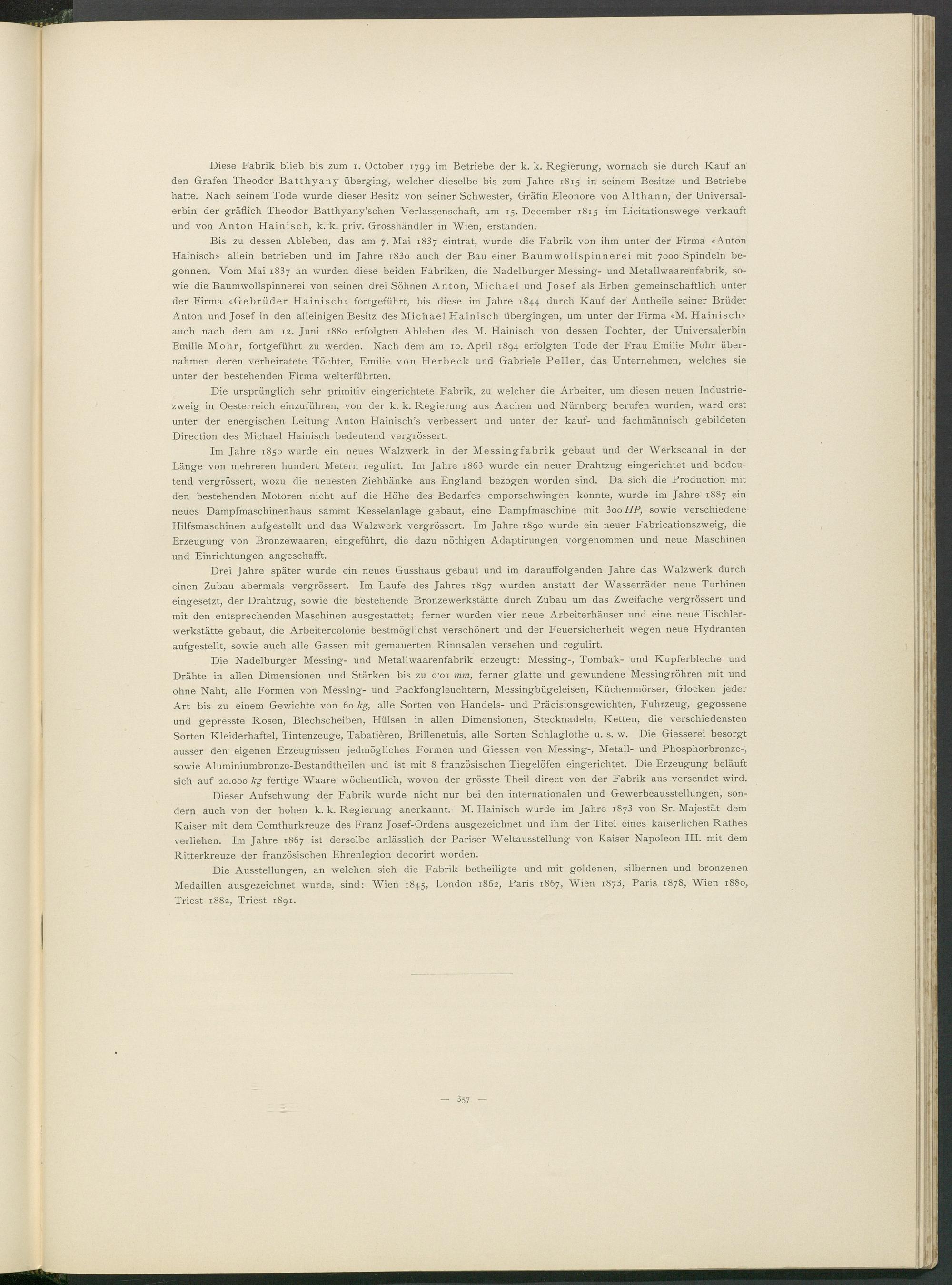 Bis zu dessen Ableben, das am 7. Mai 1837 eintrat, wurde die Fabrik von ihm unter der Firma «Anton Hainisch» allein betrieben und im Jahre i83o auch der Bau einer Baumwollspinnerei mit 7000 Spindeln begonnen. Vom Mai 1837 an wurden diese beiden Fabriken, die Nadelburger Messing- und Metallwaarenfabrik, sowie die Baumwollspinnerei von seinen drei Söhnen Anton, Michael und Josef als Erben gemeinschaftlich unter der Firma «Gebrüder Hainisch» fortgeführt, bis diese im Jahre 1844 durch Kauf der Antheile seiner Brüder Anton und Josef in den alleinigen Besitz des Michael Hainisch übergingen, um unter der Firma «M. Hainisch» auch nach dem am 12. Juni 1880 erfolgten Ableben des M. Hainisch von dessen Tochter, der Universalerbin Emilie Mohr, fortgeführt zu werden. Nach dem am 10. April 1894 erfolgten Tode der Frau Emilie Mohr übernahmen deren verheiratete Töchter, Emilie von Herbeck und Gabriele Peiler, das Unternehmen, welches sie unter der bestehenden Firma weiterführten.