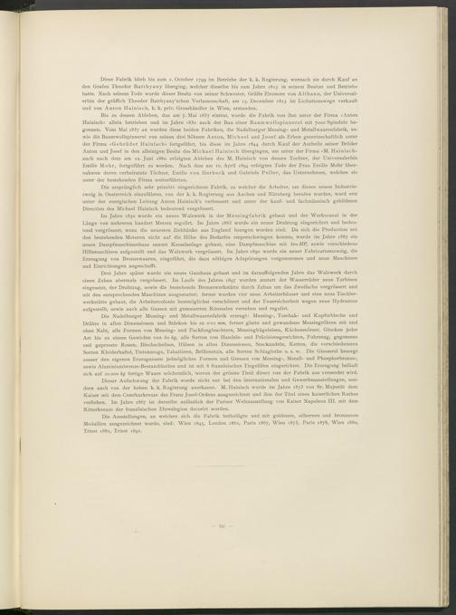 Die ursprünglich sehr primitiv eingerichtete Fabrik, zu welcher die Arbeiter, um diesen neuen Industriezweig in Oesterreich einzuführen, von der k. k. Regierung aus x\achen und Nürnberg berufen wurden, ward erst unter der energischen Leitung Anton Hainisch’s verbessert und unter der kauf- und fachmännisch gebildeten Direction des Michael Hainisch bedeutend vergrössert.