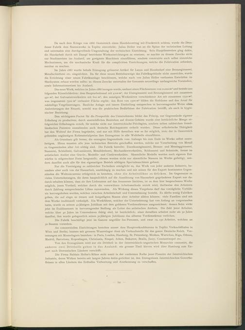 Nur die Vereinigung so zahlreicher Techniken ermöglicht es, das Werk von jeder anderen Industrie, besonders aber auch von der Hausarbeit, unabhängig zu machen und mit seinen für den Export bestimmten Gegenständen die Weltconcurrenz erfolgreich zu bestehen, ohne die Arbeitslöhne zu drücken. Im Gegensätze zu vielen Unternehmungen, die ihren hauptsächlich auf die Ausnützung von Hausarbeit gegründeten Export nur dadurch erhalten können, dass sie ihre Lieferanten auf das Aeusserste limitiren, ist es dem hier besprochenen Werke möglich, jenen Vortheil, welcher durch die vorerwähnte Arbeitsmethode erzielt wird, theilweise den Arbeitern durch Zahlung entsprechender Löhne zuzuwenden. Als Wirkung dieses Vorgehens darf das vorzügliche Verhältnis hervorgehoben werden, welches zwischen Arbeiterschaft und Unternehmung besteht. Es dürfte wenig Fabriken geben, die auf ein # en so treuen und festgefügten Stamm alter Arbeiter zählen können; viele Familien sind mit dem Werke traditionell verknüpft. Ein Werkführer, welcher der Unternehmung fast von Anfang an vorgestanden hatte, wurde zu seinem 40jährigen Jubiläum mit dem goldenen Verdienstkreuze ausgezeichnet; dessen Sohn wirkt jetzt im Etablissement in hervorragender Stellung als Leiter des artistischen Ateliers. Die Zahl jener Arbeiter, welche über 40 Jahre im Unternehmen thätig sind, ist beträchtlich; einer derselben arbeitet mehr als 50 Jahre daselbst, ihm wurde gelegentlich seines 50jährigen Jubiläums das silberne Verdienstkreuz verliehen.