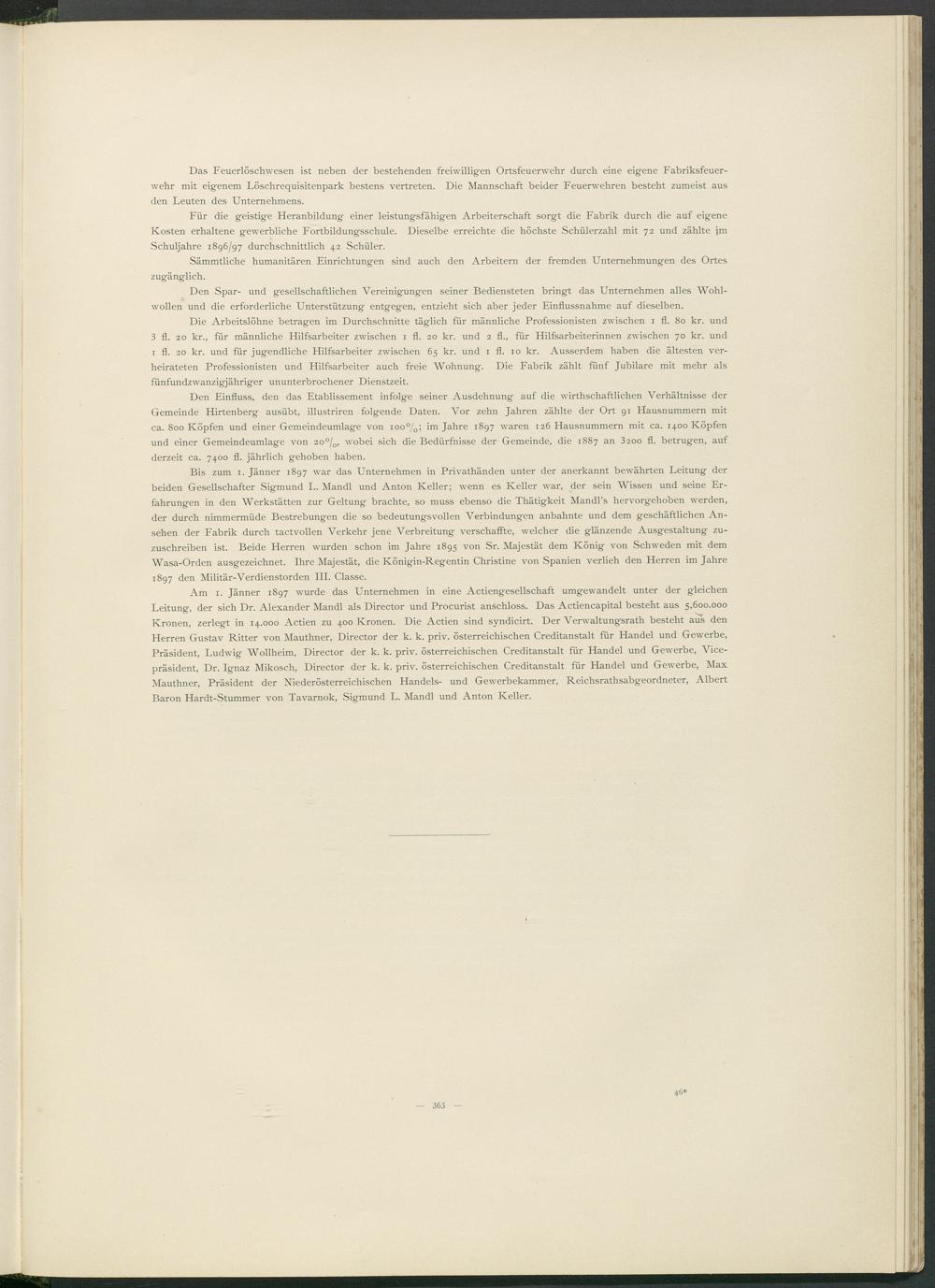 Bis zum 1. Jänner 1897 war das Unternehmen in Privathänden unter der anerkannt bewährten Leitung der beiden Gesellschafter Sigmund L. Mandl und Anton Keller; wenn es Keller war, der sein Wissen und seine Erfahrungen in den Werkstätten zur Geltung brachte, so muss ebenso die Thätigkeit Mandl’s hervorgehoben werden, der durch nimmermüde Bestrebungen die so bedeutungsvollen Verbindungen anbahnte und dem geschäftlichen Ansehen der Fabrik durch tactvollen Verkehr jene Verbreitung verschaffte, welcher die glänzende Ausgestaltung zuzuschreiben ist. Beide Herren wurden schon im Jahre 1895 von Sr. Majestät dem König von Schweden mit dem Wasa-Orden ausgezeichnet. Ihre Majestät, die Königin-Regentin Christine von Spanien verlieh den Herren im Jahre 1897 den Militär-Verdienstorden III. Classe.