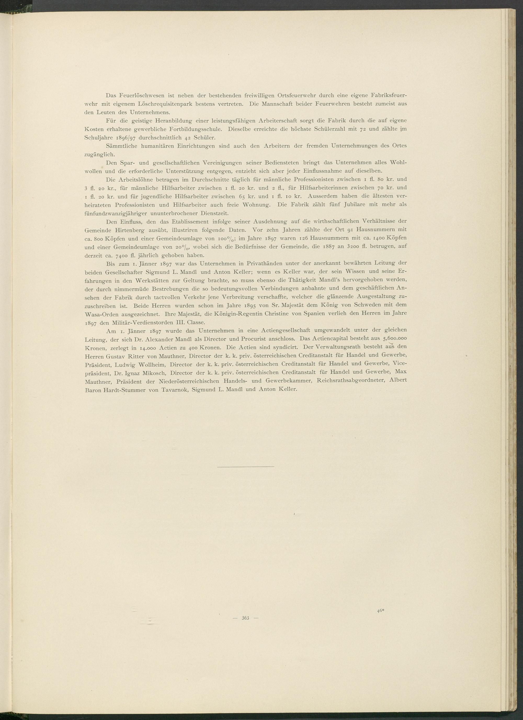 Am 1. Jänner 1897 wurde das Unternehmen in eine Actiengesellschaft umgewandelt unter der gleichen Leitung, der sich Dr. Alexander Mandl als Director und Procurist anschloss. Das Actiencapital besteht aus 5,600.000 Kronen, zerlegt in 14.000 Actien zu 400 Kronen. Die Actien sind syndicirt. Der Verwaltungsrath besteht aus den Herren Gustav Ritter von Mauthner, Director der k. k. priv. österreichischen Creditanstalt für Handel und Gewerbe, Präsident, Ludwig Wollheim, Director der k. k. priv. österreichischen Creditanstalt für Handel und Gewerbe, Vice- präsident, Dr. Ignaz Mikosch, Director der k. k. priv. österreichischen Creditanstalt für Handel und Gewerbe, Max Mauthner, Präsident der Niederösterreichischen Handels- und Gewerbekammer, Reichsrathsabgeordneter, Albert Baron Hardt-Stummer von Tavarnok, Sigmund L. Mandl und Anton Keller.