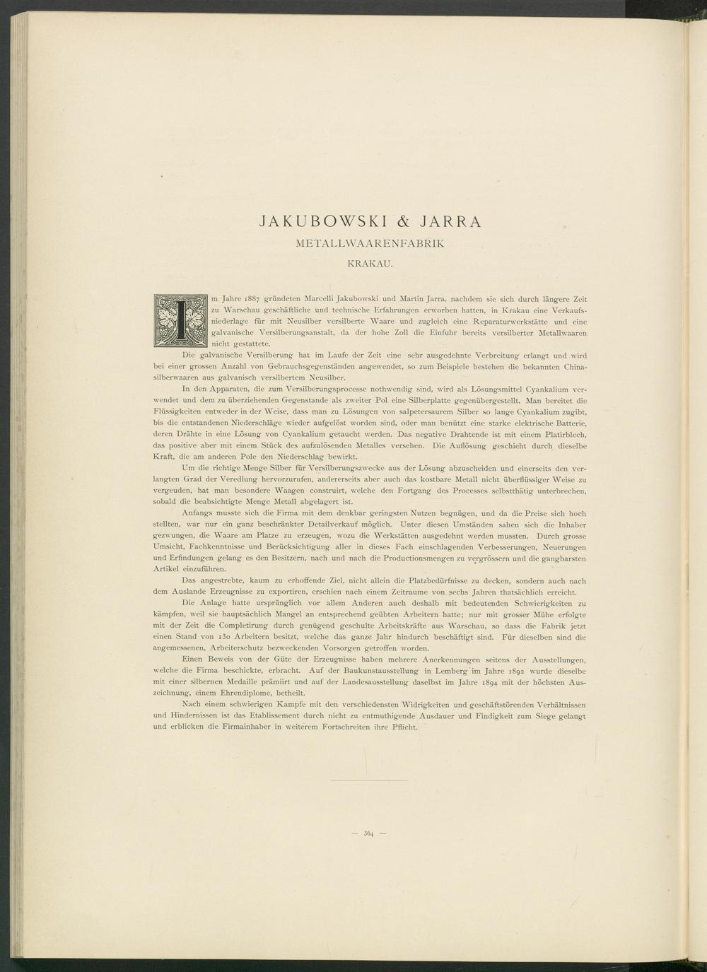 m Jahre 1887 gründeten Marcelli Jakubowski und Martin Jarra, nachdem sie sich durch längere Zeit zu Warschau geschäftliche und technische Erfahrungen erworben hatten, in Krakau eine Verkaufsniederlage für mit Neusilber versilberte Waare und zugleich eine Reparaturwerkstätte und eine galvanische Versilberungsanstalt, da der hohe Zoll die Einfuhr bereits versilberter Metallwaaren nicht gestattete.