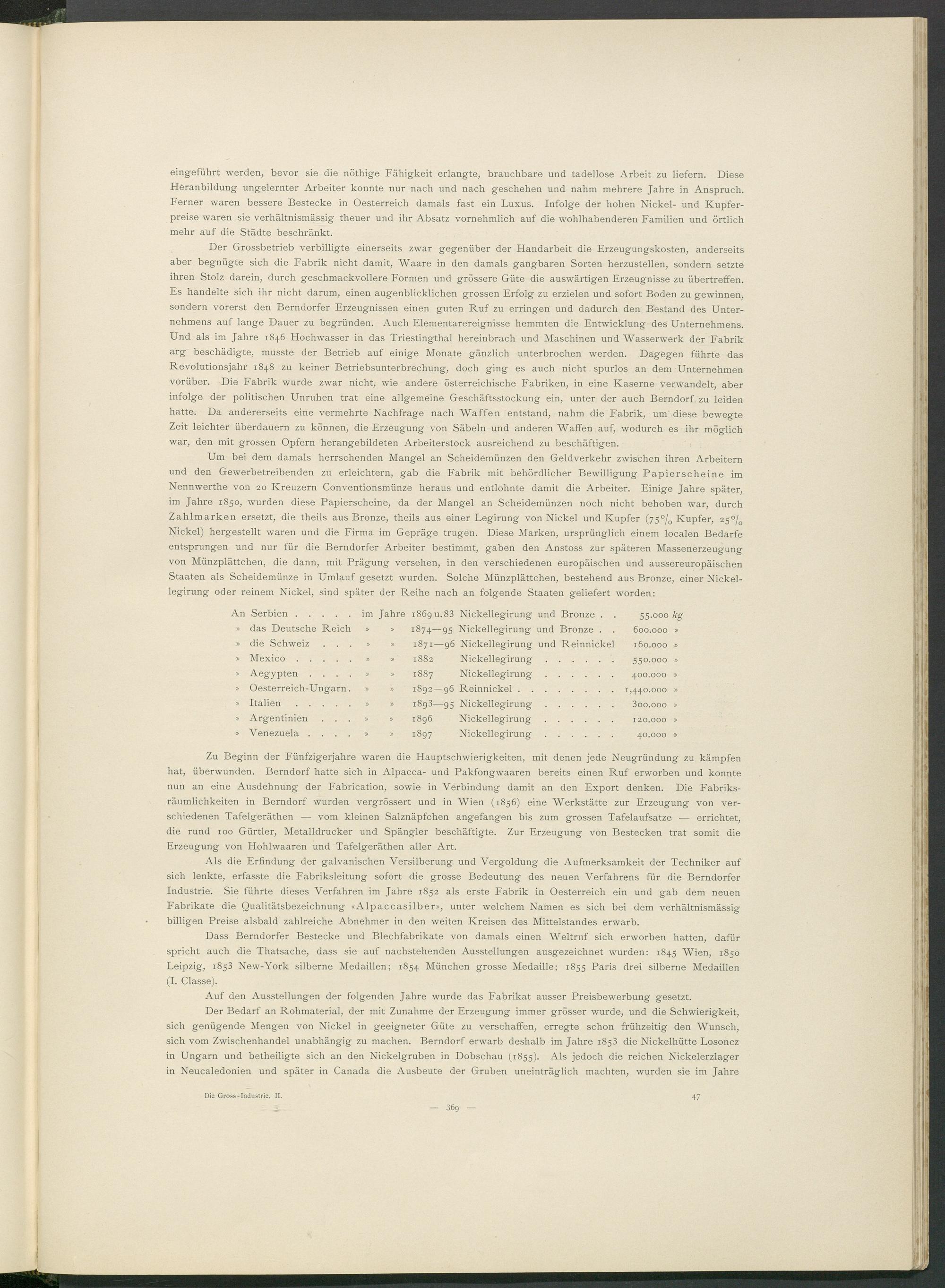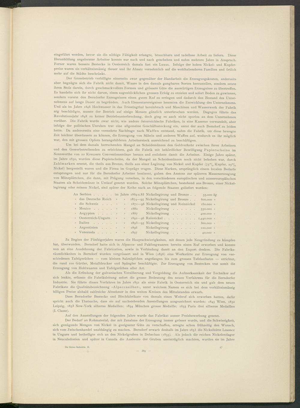 Um bei dem damals herrschenden Mangel an Scheidemünzen den Geldverkehr zwischen ihren Arbeitern und den Gewerbetreibenden zu erleichtern, gab die Fabrik mit behördlicher Bewilligung Papierscheine im Nennwerthe von 20 Kreuzern Conventionsmünze heraus und entlohnte damit die Arbeiter. Einige Jahre später, im Jahre 1850, wurden diese Papierscheine, da der Mangel an Scheidemünzen noch nicht behoben war, durch Zahlmarken ersetzt, die theils aus Bronze, theils aus einer Legirung von Nickel und Kupfer (75% Kupfer, 25°/ 0 Nickel) hergestellt waren und die Firma im Gepräge trugen. Diese Marken, ursprünglich einem localen Bedarfe entsprungen und nur für die Berndorfer Arbeiter bestimmt, gaben den Anstoss zur späteren Massenerzeugung von Münzplättchen, die dann, mit Prägung versehen, in den verschiedenen europäischen und aussereuropäischen Staaten als Scheidemünze in Umlauf gesetzt wurden. Solche Münzplättchen, bestehend aus Bronze, einer Nickel- legirung oder reinem Nickel, sind später der Reihe nach an folgende Staaten geliefert worden: