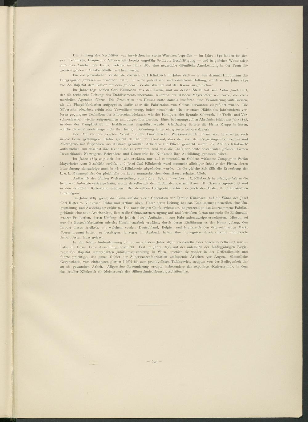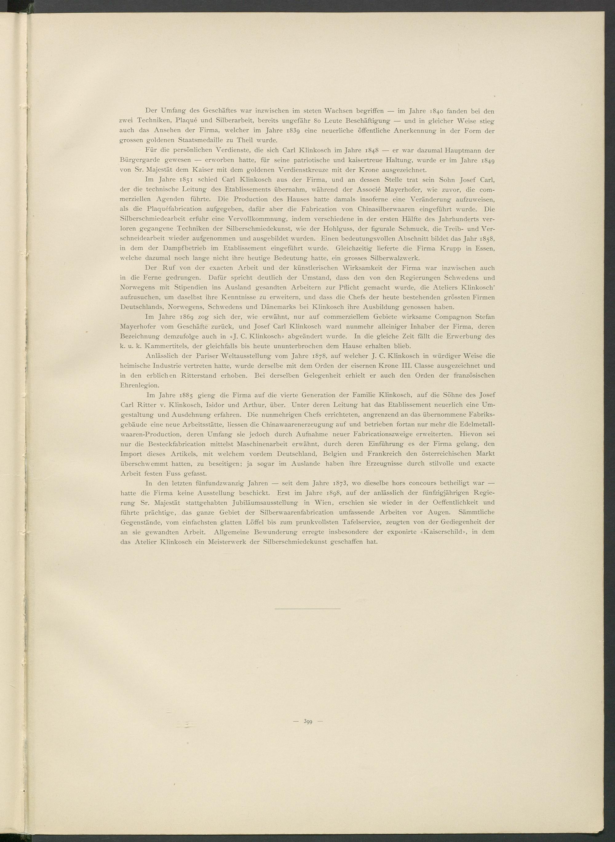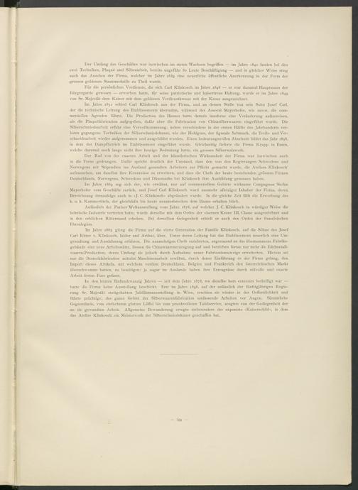 In den letzten fünfundzwanzig Jahren — seit dem Jahre 1873, wo dieselbe hors concours betheiligt war — hatte die Firma keine Ausstellung beschickt. Erst im Jahre 1898, auf der anlässlich der fünfzigjährigen Regierung Sr. Majestät stattgehabten Jubiläumsausstellung in Wien, erschien sie wieder in der OÖffentlichkeit und führte prächtige, das ganze Gebiet der Silberwaarenfabrication umfassende Arbeiten vor Augen. Sämmtliche Gegenstände, vom einfachsten glatten Löffel bis zum prunkvollsten Tafelservice, zeugten von der Gediegenheit der an sie gewandten Arbeit. Allgemeine Bewunderung erregte insbesondere der exponirte «Kaiserschild», in dem das Atelier Klinkosch ein Meisterwerk der Silberschmiedekunst geschaffen hat.