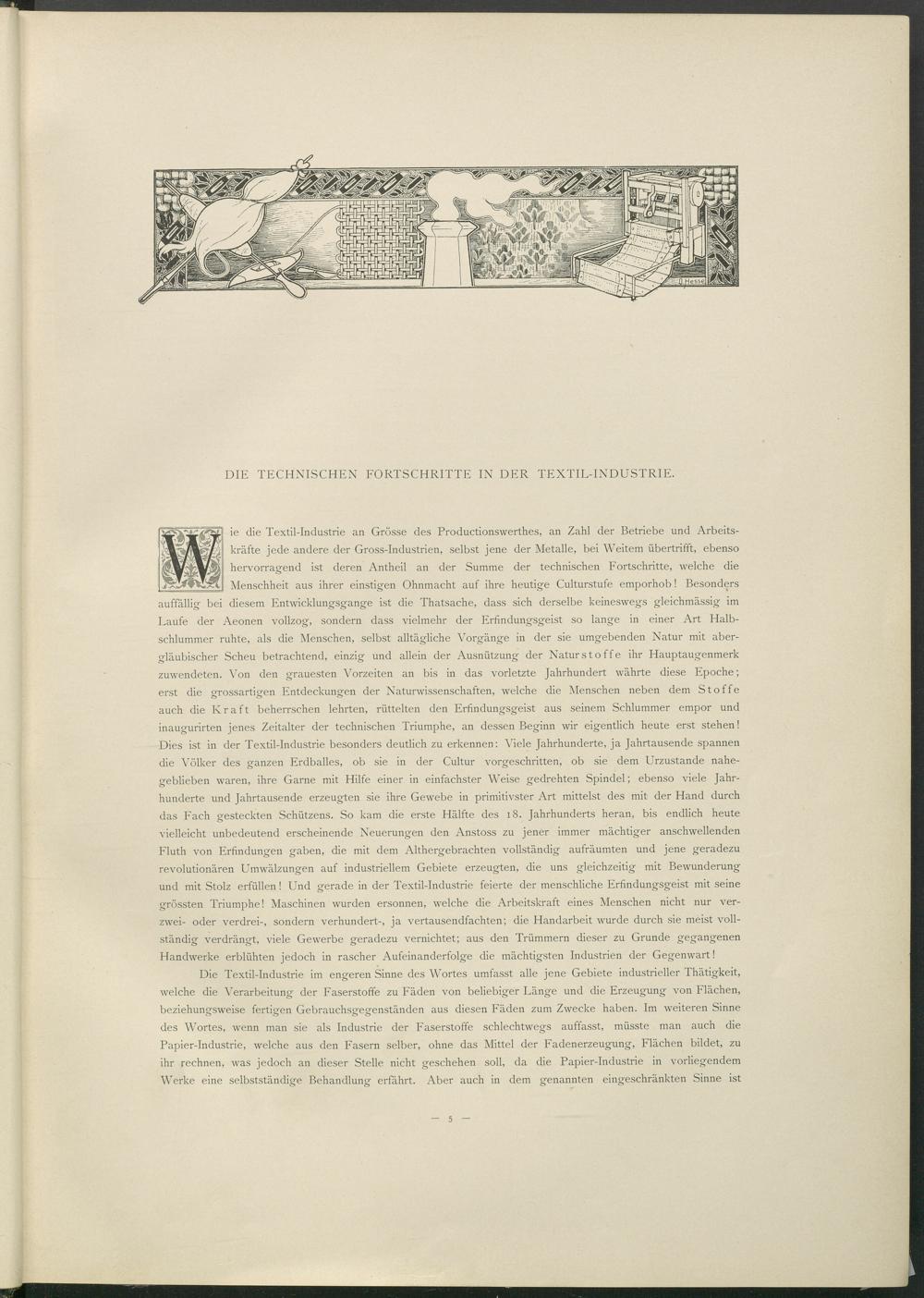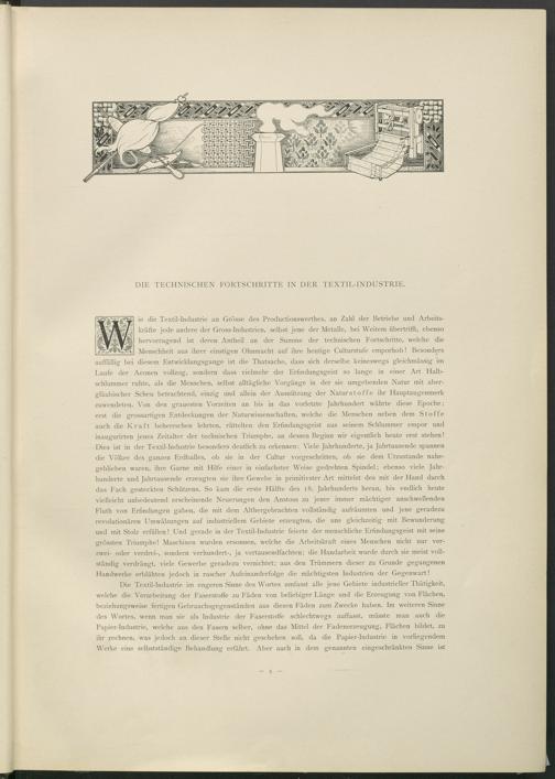 Die Textil-Industrie im engeren Sinne des Wortes umfasst alle jene Gebiete industrieller Thätigkeit, welche die Verarbeitung der Faserstoffe zu Fäden von beliebiger Länge und die Erzeugung von Flächen, beziehungsweise fertigen Gebrauchssfesrenständen aus diesen Fäden zum Zwecke haben. Im weiteren Sinne des Wortes, wenn man sie als Industrie der Faserstoffe schlechtwegs auffasst, müsste man auch die Papier-Industrie, welche aus den Fasern selber, ohne das Mittel der Fadenerzeugung, Flächen bildet, zu ihr rechnen, was jedoch an dieser Stelle nicht geschehen soll, da die Papier-Industrie in vorliegendem Werke eine selbstständige Behandlung erfährt. Aber auch in dem genannten eingeschränkten Sinne ist