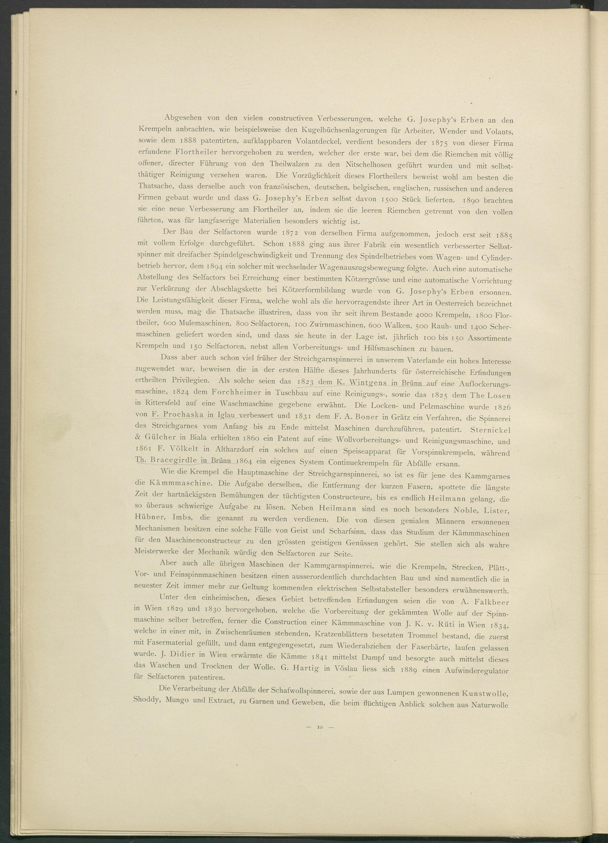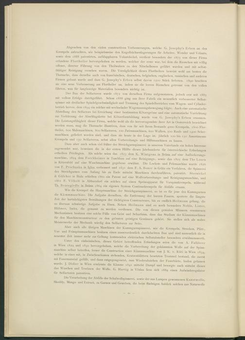 Der Bau der Selfactoren wurde 1872 von derselben Firma aufgenommen, jedoch erst seit 1885 mit vollem Erfolge durchgeführt. Schon 1888 ging aus ihrer Fabrik ein wesentlich verbesserter Selbstspinner mit dreifacher Spindelgeschwindigkeit und Trennung des Spindelbetriebes vom Wagen- und Cylinder- betrieb hervor, dem 1894 ein solcher mit wechselnder Wagenauszugsbewegung folgte. Auch eine automatische Abstellung des Selfactors bei Erreichung einer bestimmten Kötzergrösse und eine automatische Vorrichtung zur Verkürzung der Abschlagskette bei Kötzerformbildung wurde von G. Josephy’s Erben ersonnen. Die Leistungsfähigkeit dieser Firma, welche wohl als die hervorragendste ihrer Art in Oesterreich bezeichnet werden muss, mag die Thatsache illustriren, dass von ihr seit ihrem Bestände 4000 Krempeln, 1800 Flortheiler, 600 Mulemaschinen, 800 Selfactoren, 100 Zwirnmaschinen, 600 Walken, 500 Rauh- und 1400 Schermaschinen geliefert worden sind, und dass sie heute in der Lage ist, jährlich 100 bis 150 Assortimente Krempeln und 150 Selfactoren, nebst allen Vorbereitungs- und Hilfsmaschinen zu bauen.