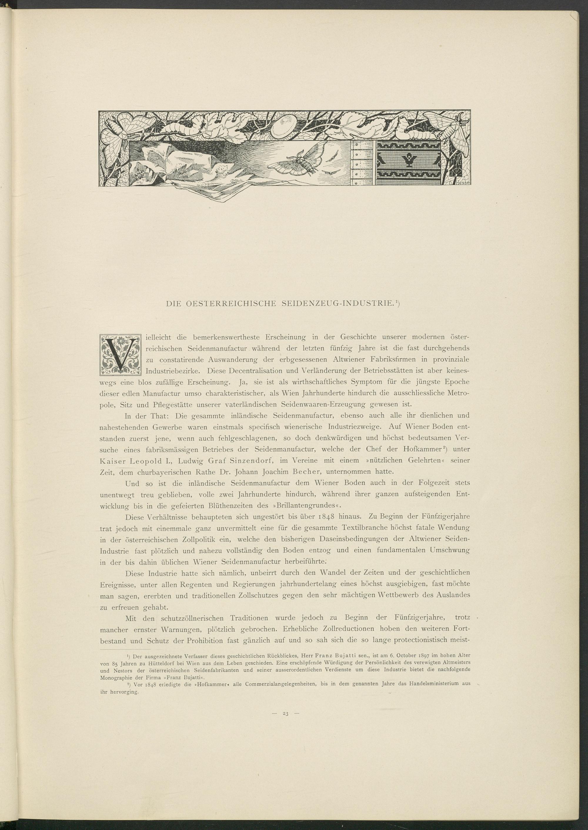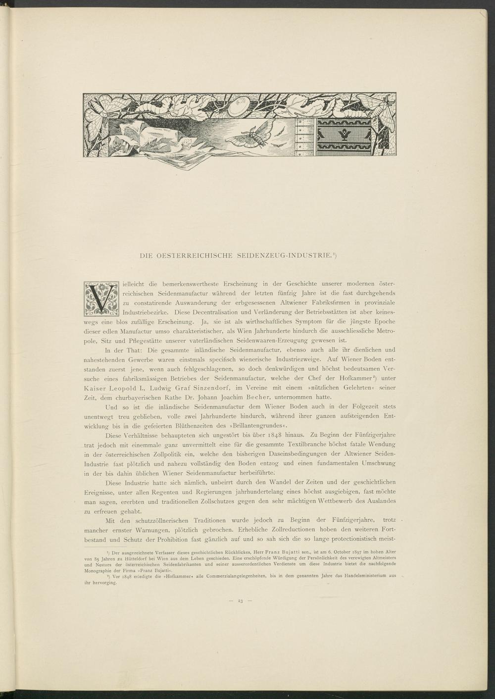 *) Der ausgezeichnete Verfasser dieses geschichtlichen Rückblickes, Herr Franz Bujatti sen., ist am 6. October 1897 im hohen Alter von 85 Jahren zu Hütteldorf bei Wien aus dem Leben geschieden. Eine erschöpfende Würdigung der Persönlichkeit des verewigten Altmeisters und Nestors der österreichischen Seidenfabrikanten und seiner ausserordentlichen Verdienste um diese Industrie bietet die nachfolgende Monographie der Firma »Franz Bujatti«.