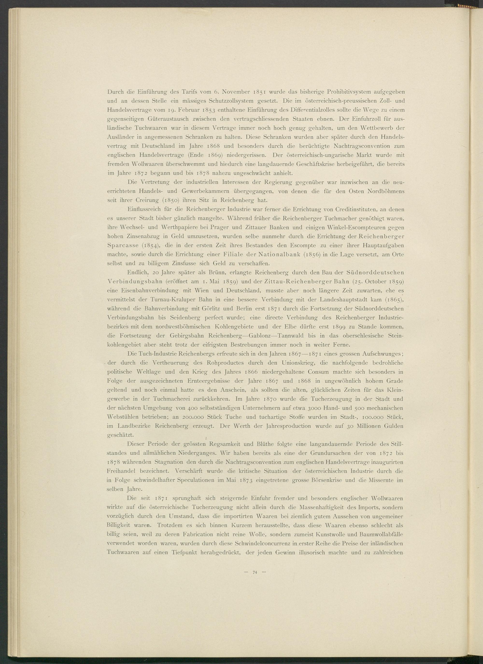 Dieser Periode der grössten Regsamkeit und Blüthe folgte eine langandauernde Periode des Still­standes und allmählichen Niederganges. Wir haben bereits als eine der Grundursachen der von 1872 bis 1878 währenden Stagnation den durch die Nachtragsconvention zum englischen Handelsverträge inaugurirten Freihandel bezeichnet. Verschärft wurde die kritische Situation der österreichischen Industrie durch die in Folge schwindelhafter Speculationen im Mai 1873 eingetretene grosse Börsenkrise und die Missernte im selben Jahre.