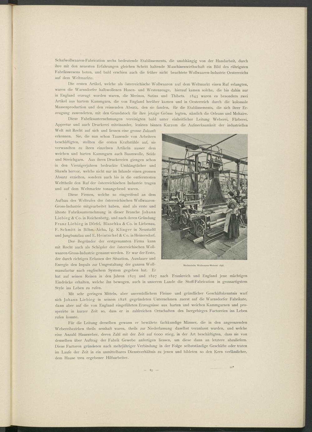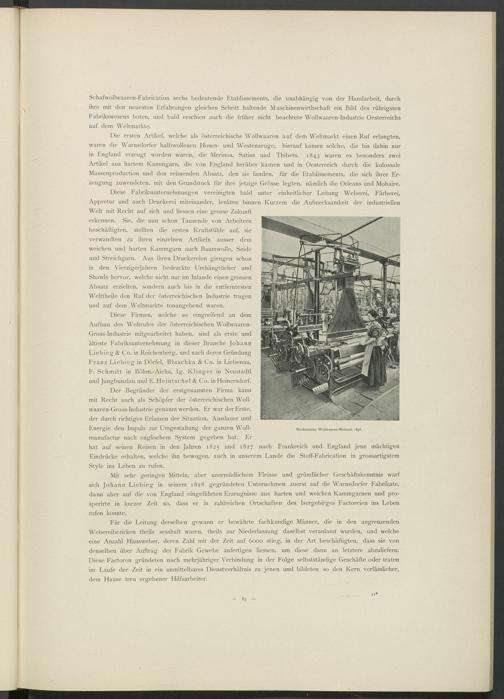 Diese Firmen, welche so eingreifend an dem Aufbau des Weltrufes der österreichischen Wollwaaren- Gross-Industrie mitgearbeitet haben, sind als erste und älteste Fabriksunternehmung in dieser Branche Johann Liebieg & Co. in Reichenberg, und nach deren Gründung Franz Liebieg in Dörfel, Blaschka & Co. in Liebenau,