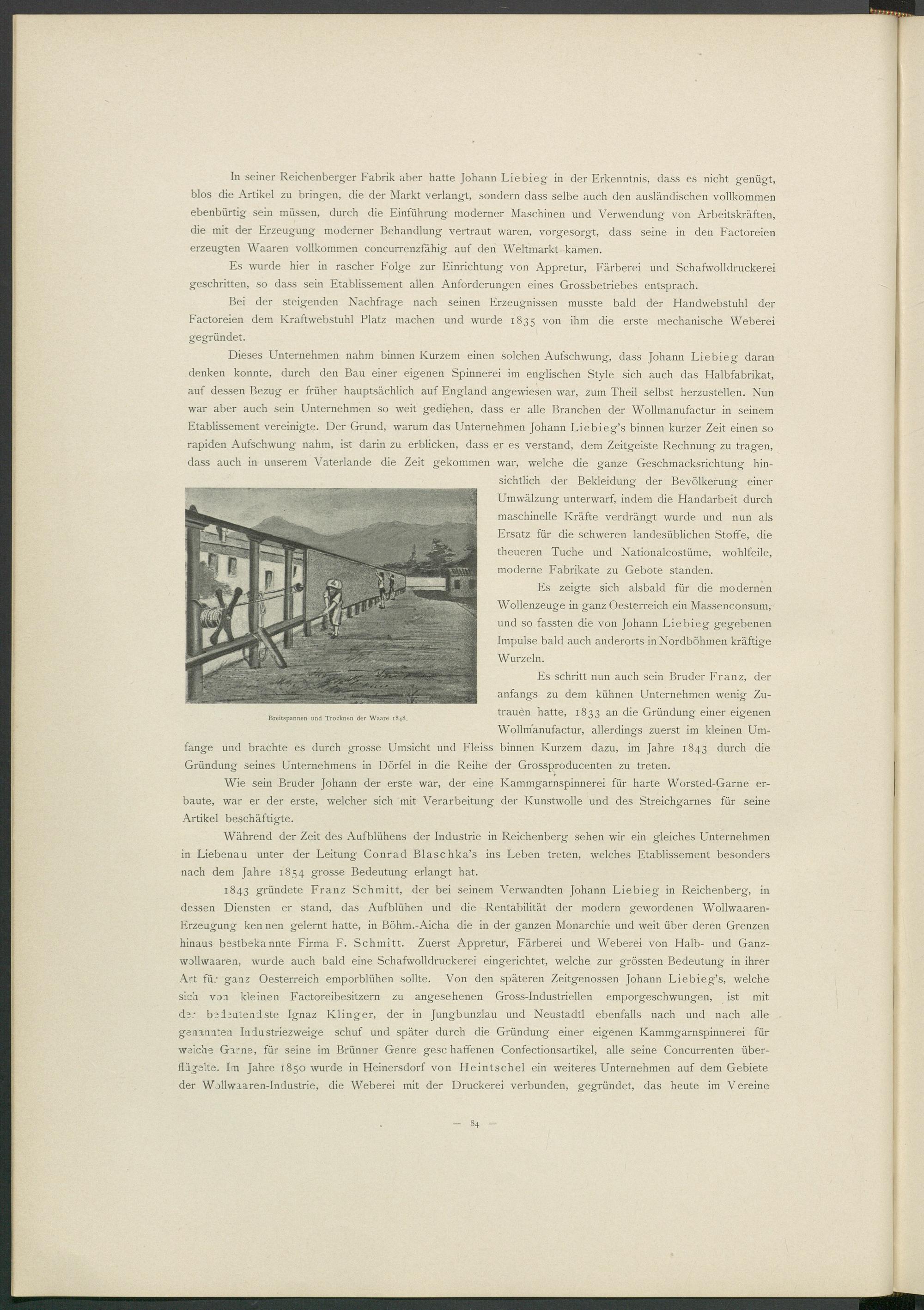 1843 gründete Franz Schmitt, der bei seinem Verwandten Johann Liebieg in Reichenberg, in dessen Diensten er stand, das Aufblühen und die Rentabilität der modern gewordenen Wollwaaren- Erzeugung ken nen gelernt hatte, in Böhm.-Aicha die in der ganzen Monarchie und weit über deren Grenzen hinaus bsstbekannte Firma F. Schmitt. Zuerst Appretur, Färberei und Weberei von Halb- und Ganz- wollwaaren, wurde auch bald eine Schafwolldruckerei eingerichtet, welche zur grössten Bedeutung in ihrer Art; ganz Oesterreich emporblühen sollte. Von den späteren Zeitgenossen Johann Liebiegs, welche sich von kleinen Factoreibesitzern zu angesehenen Gross-Industriellen emporgeschwungen, ist mit de: bedeutendste Ignaz Klinger, der in Jungbunzlau und Neustadtl ebenfalls nach und nach alle genannten Industriezweige schuf und später durch die Gründung einer eigenen Kammgarnspinnerei für weiche Garne, für seine im Brünner Genre geschaffenen Confectionsartikel, alle seine Concurrenten über­flügelte. Im Jahre 1850 wurde in Heinersdorf von Heintschel ein weiteres Unternehmen auf dem Gebiete der Wollwaaren-Industrie, die Weberei mit der Druckerei verbunden, gegründet, das heute im Vereine