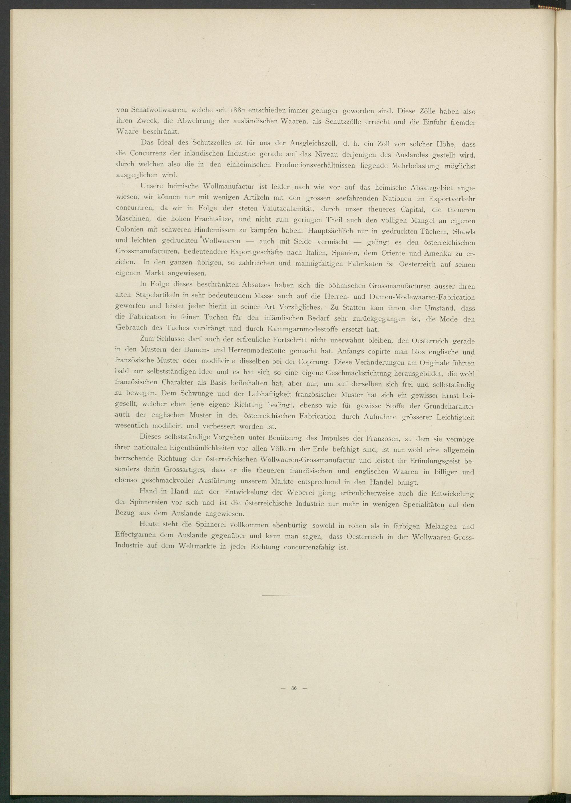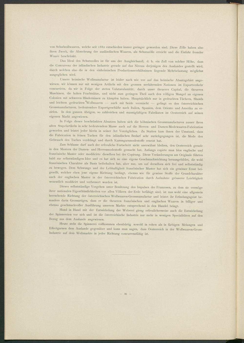 Unsere heimische Wollmanufactur ist leider nach wie vor auf das heimische Absatzgebiet angewiesen, wir können nur mit wenigen Artikeln mit den grossen seefahrenden Nationen im Exportverkehr concurriren, da wir in Folge der steten Valutacalamität, durch unser theueres Capital, die theueren Maschinen, die hohen Frachtsätze, und nicht zum geringen Theil auch den völligen Mangel an eigenen Colonien mit schweren Hindernissen zu kämpfen haben. Hauptsächlich nur in gedruckten Tüchern, Shawls und leichten gedruckten *Wollwaaren — auch mit Seide vermischt — gelingt es den österreichischen Grossmanufacturen, bedeutendere Exportgeschäfte nach Italien, Spanien, dem Oriente und Amerika zu erzielen. In den ganzen übrigen, so zahlreichen und mannigfaltigen Fabrikaten ist Oesterreich auf seinen eigenen Markt angewiesen.